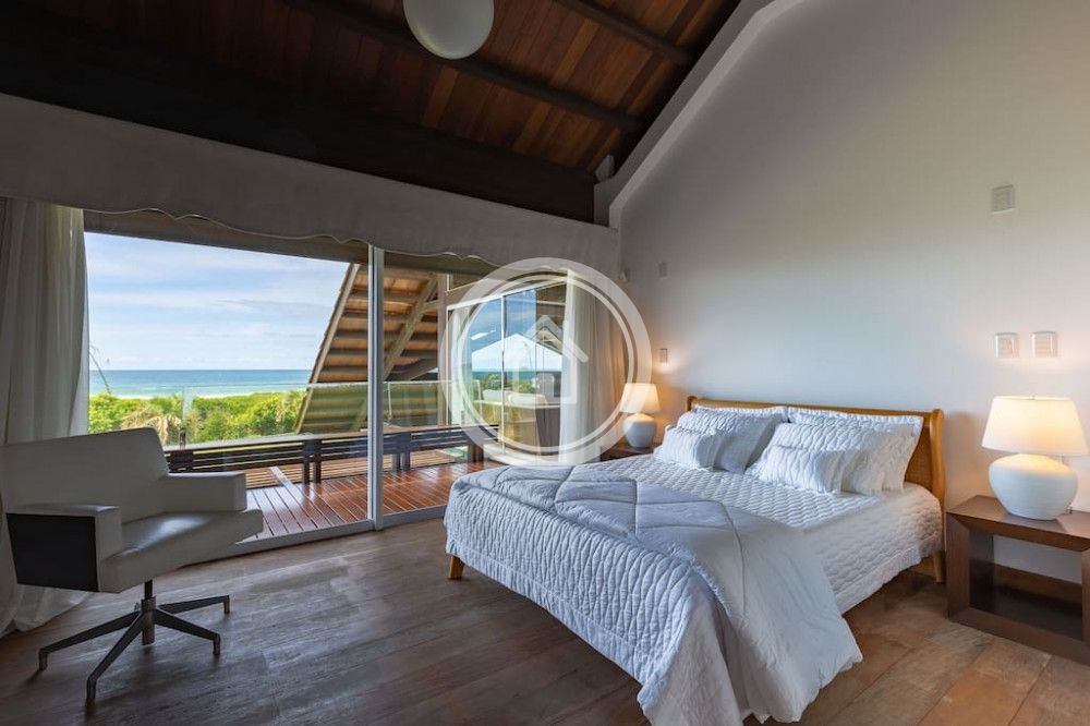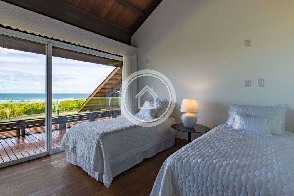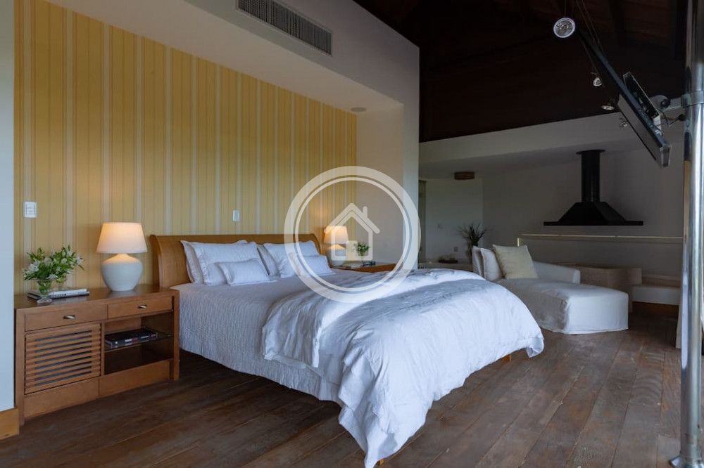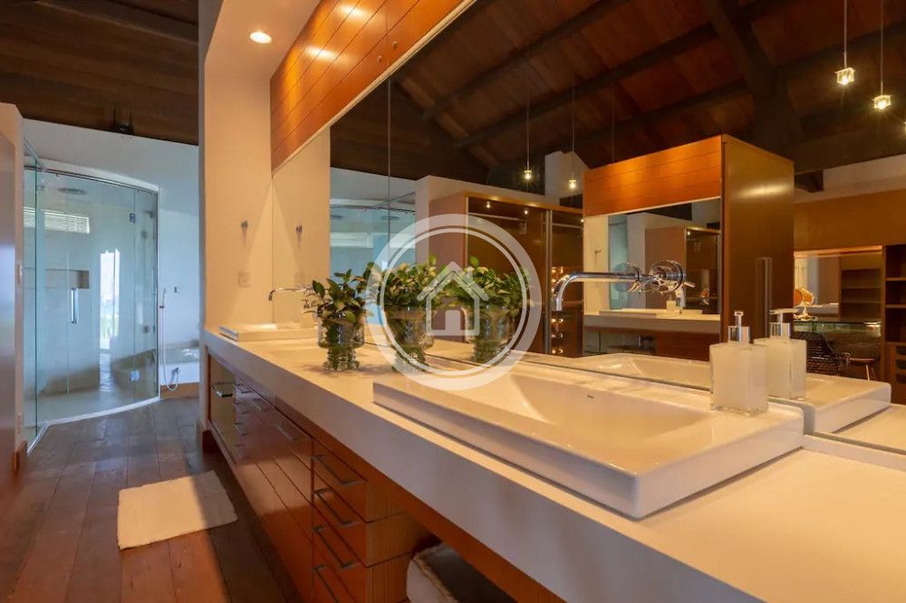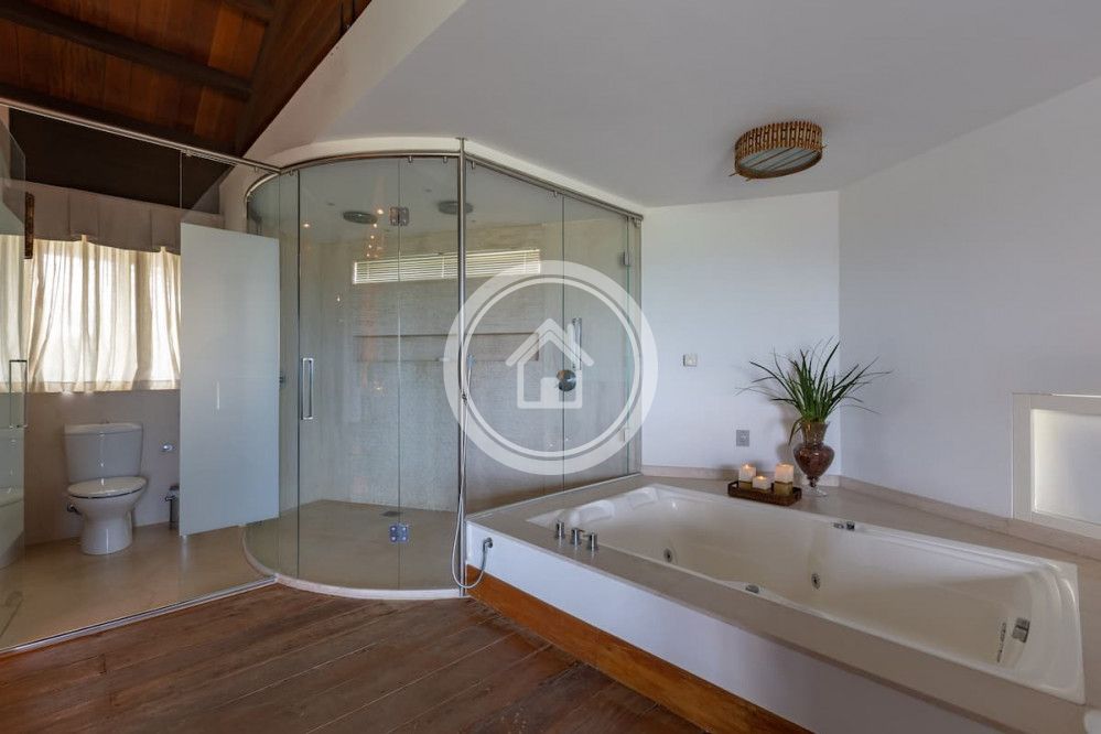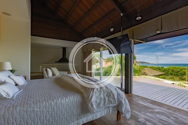 - 01 Suite Master na casa principal, com banheira e ducha dupla, cama king sob medida (2,00m x 2,30m), closet, varanda com vista para o mar, chaise, lareira, spa e ampla bancada com duas pias