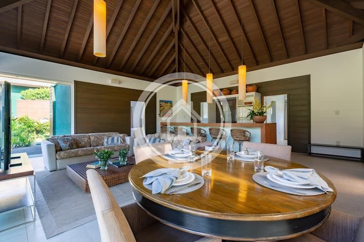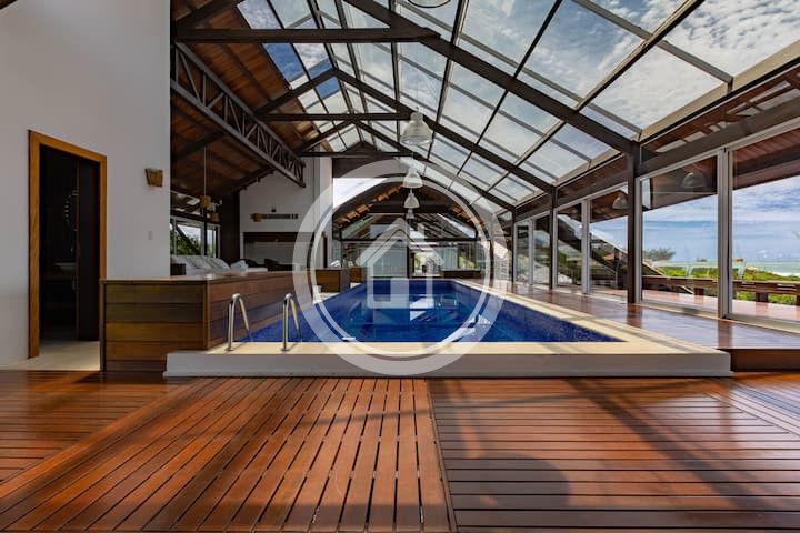 Esta maravilhosa residência com saída exclusiva para a praia, duas piscinas com aquecimento ,uma externa e outra interna, atende confortavelmente 14 pessoas, com todos ambientes climatizados.