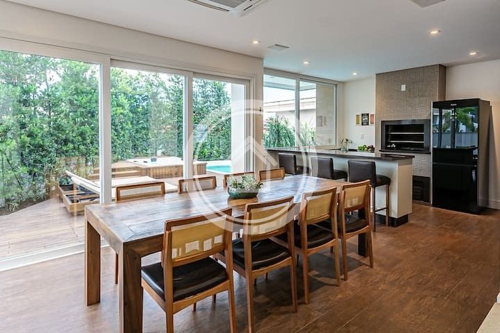 Piscina, spa com 7 lugares, área gourmet com cozinha e churrasqueira, suíte com hidromassagem, lareira, ar condicionado, salas de estar e jantar, cadeira de massagem, etc ..