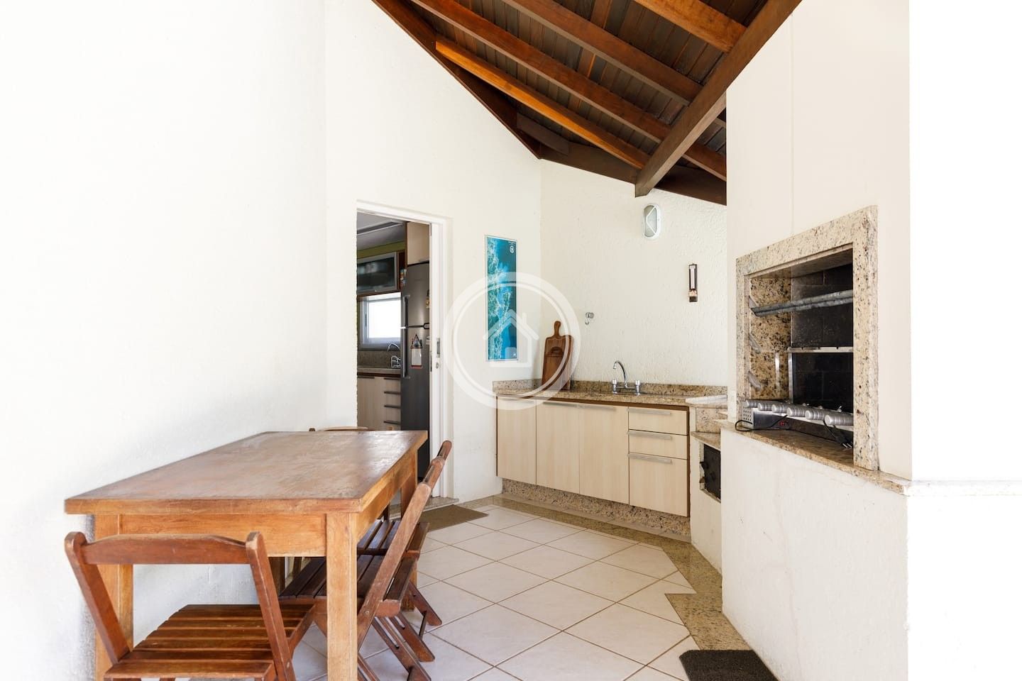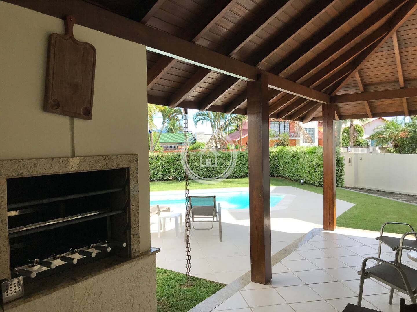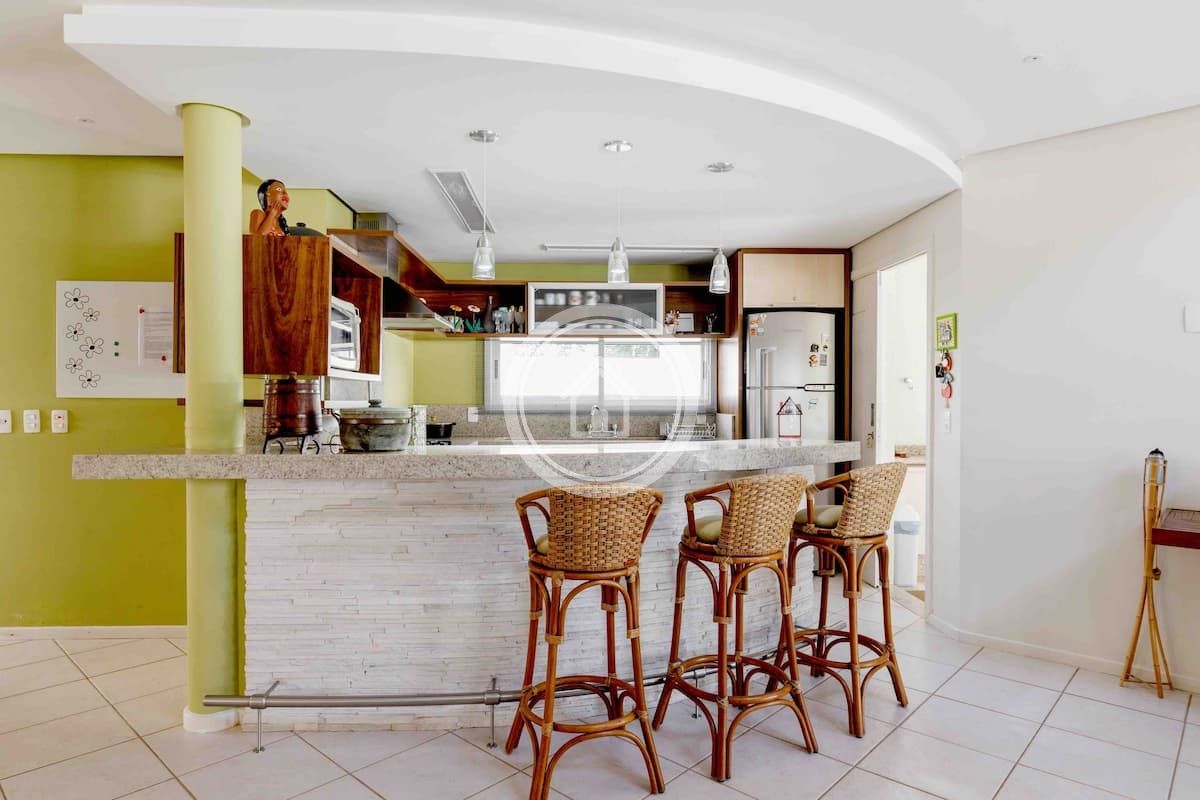 A churrasqueira fica em uma varanda, entre a cozinha e a piscina, ambiente integrados, assim como as duas salas de star e sala de jantar.