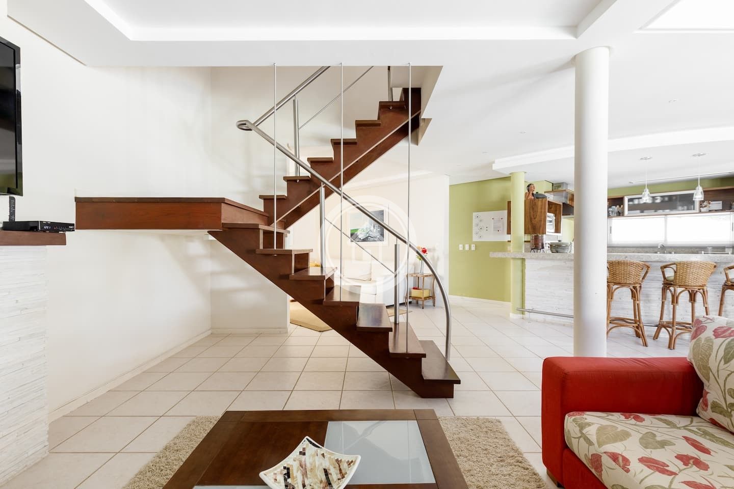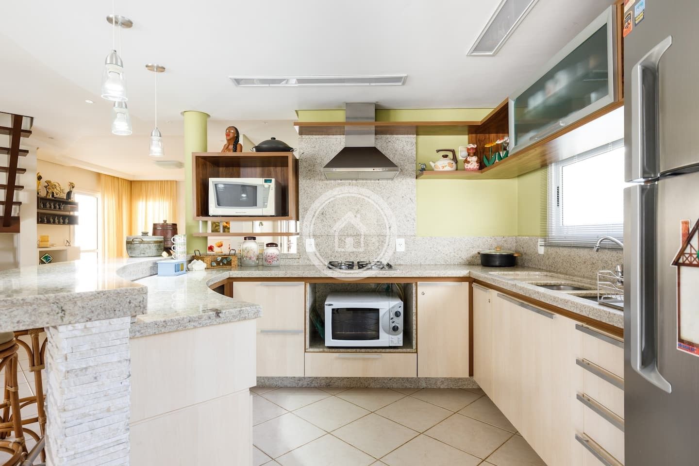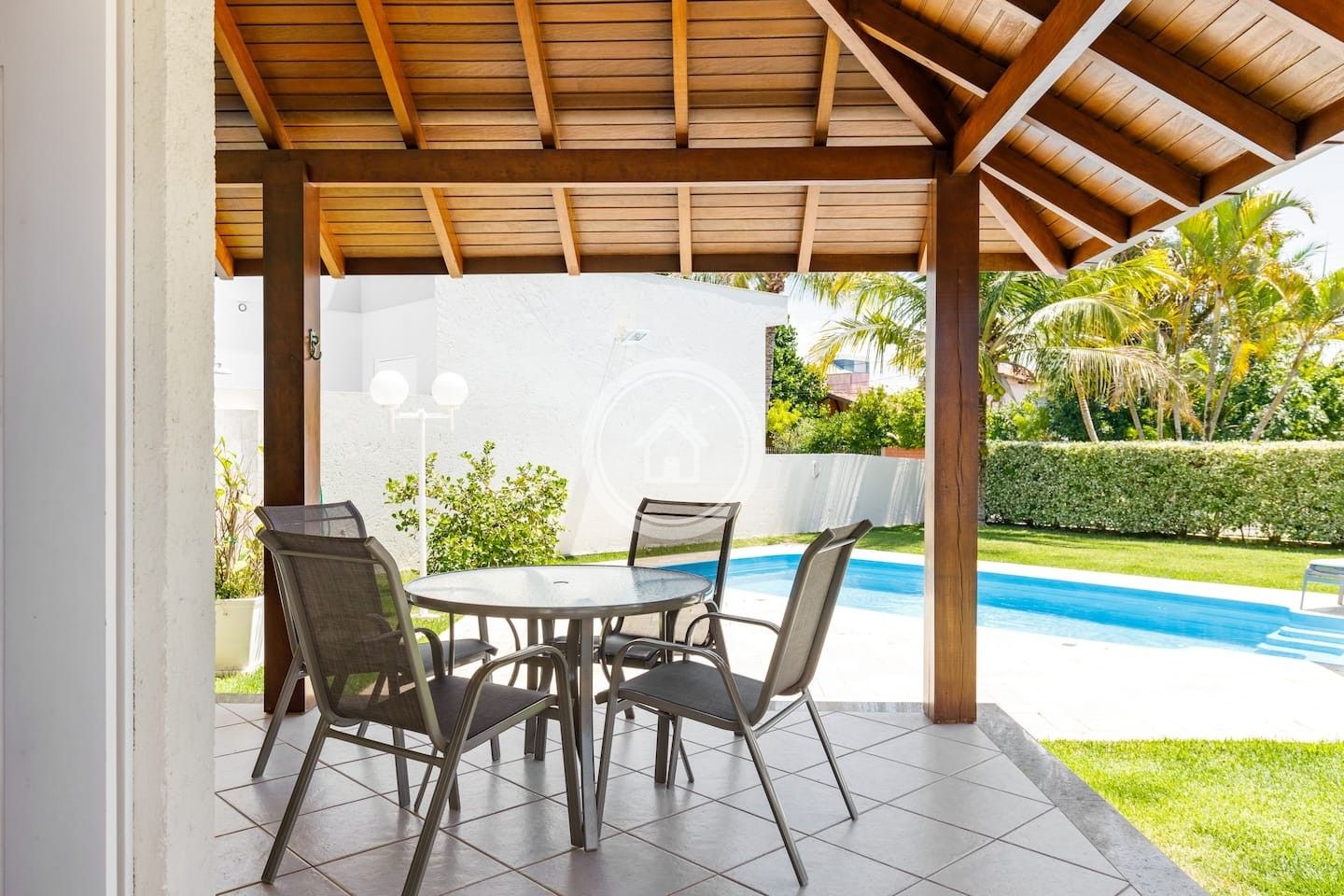 A churrasqueira fica em uma varanda, entre a cozinha e a piscina, ambiente integrados, assim como as duas salas de star e sala de jantar.