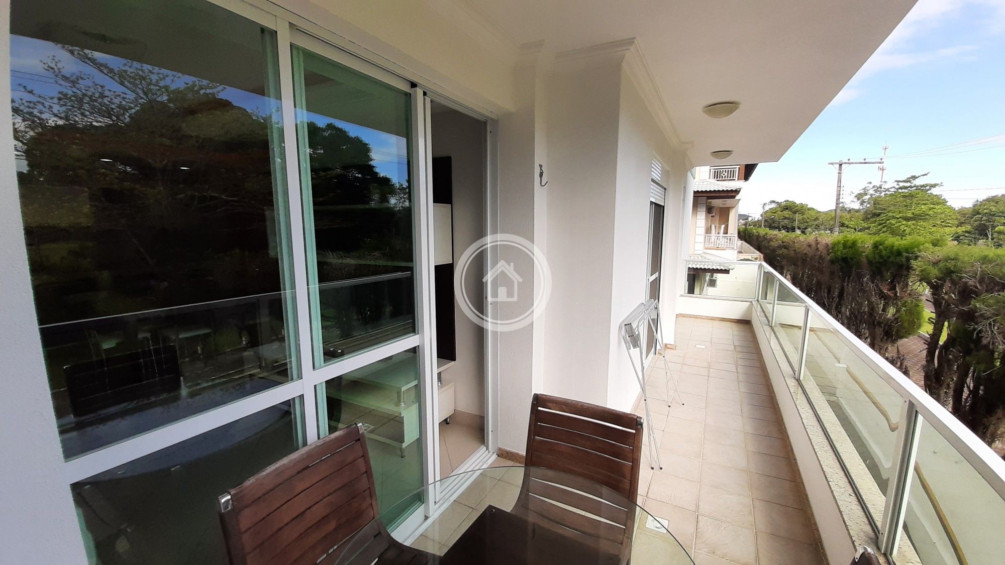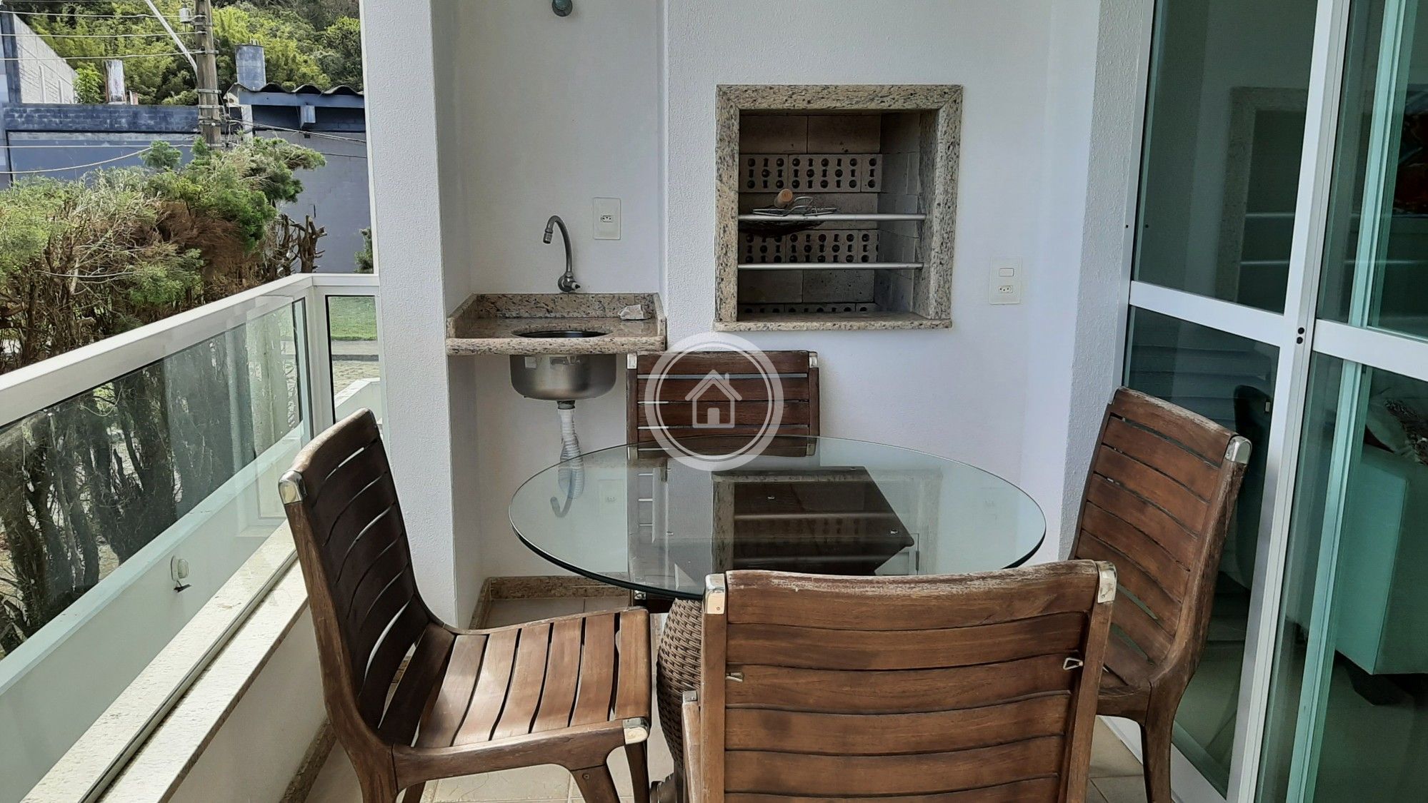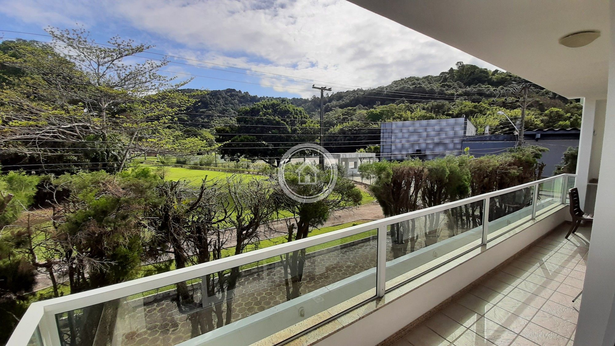 Ampla sacada com churrasqueira, com vista para o verde das montanhas da região. Inclui Wi-Fi e TV a Cabo, básico.