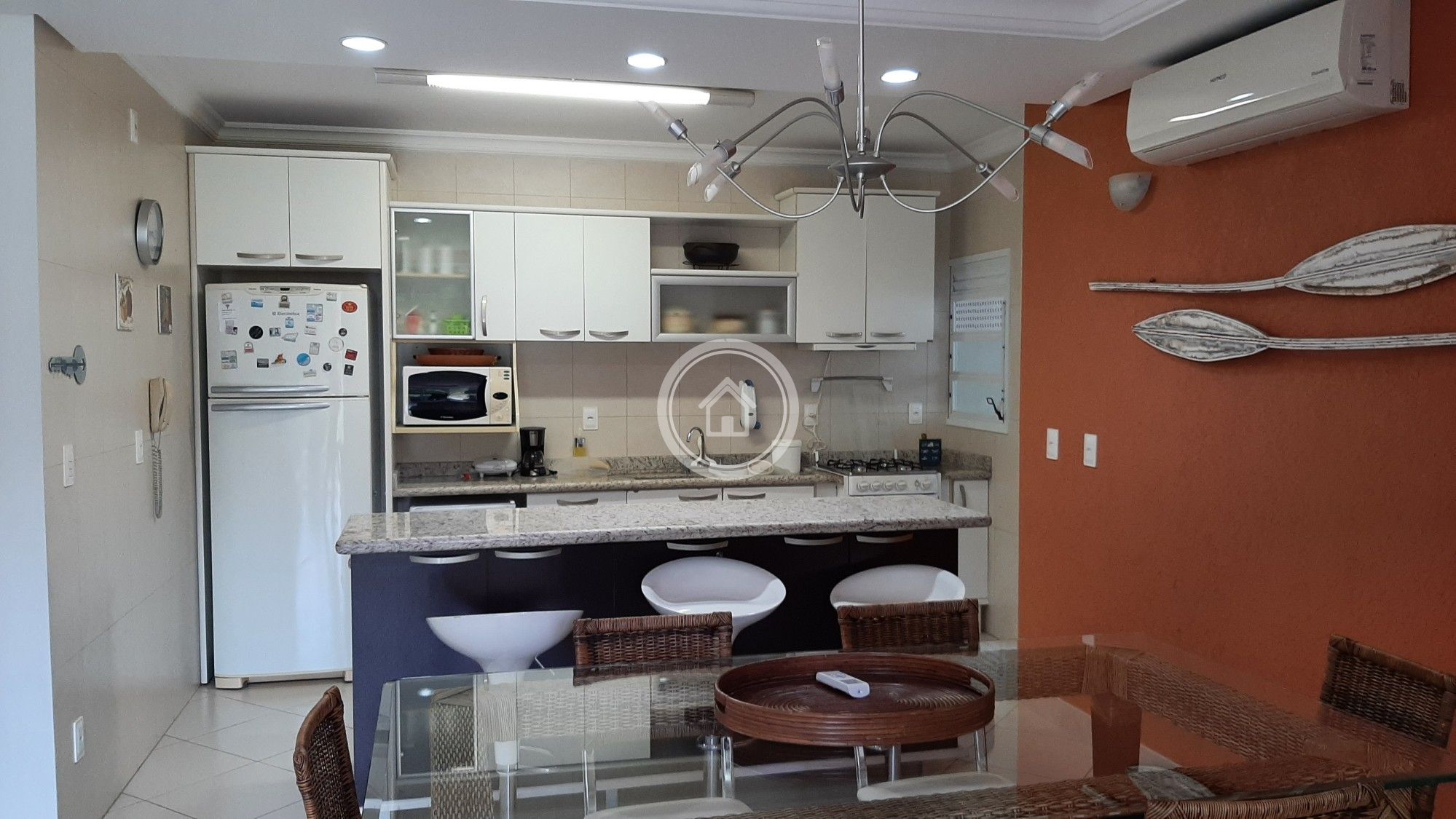 Todo preparado e decorado para seu conforto e comodidade, contem todos os utensísilos domésticos. São 3 quartos , sendo uma suíte, todos com Ar Condicionado (frio/quente) com jogos de cama e banho de boa qualidade. Cozinha completa com fogão, forno, geladeira duplex, frigobar, microondas, liquidificador, cafeteira, panela de pressão e jogos completos de jantar, chá e café. Lavanderia inclui máquina de lavar roupas, e ferro de passar.