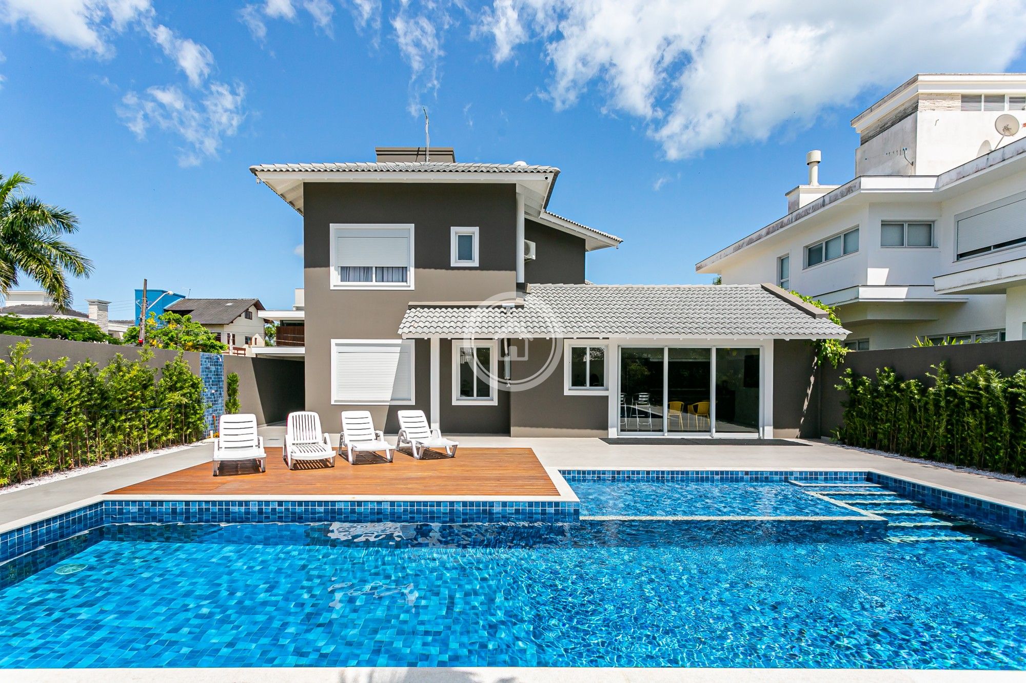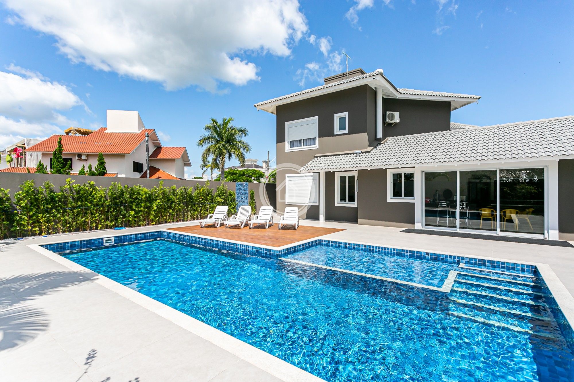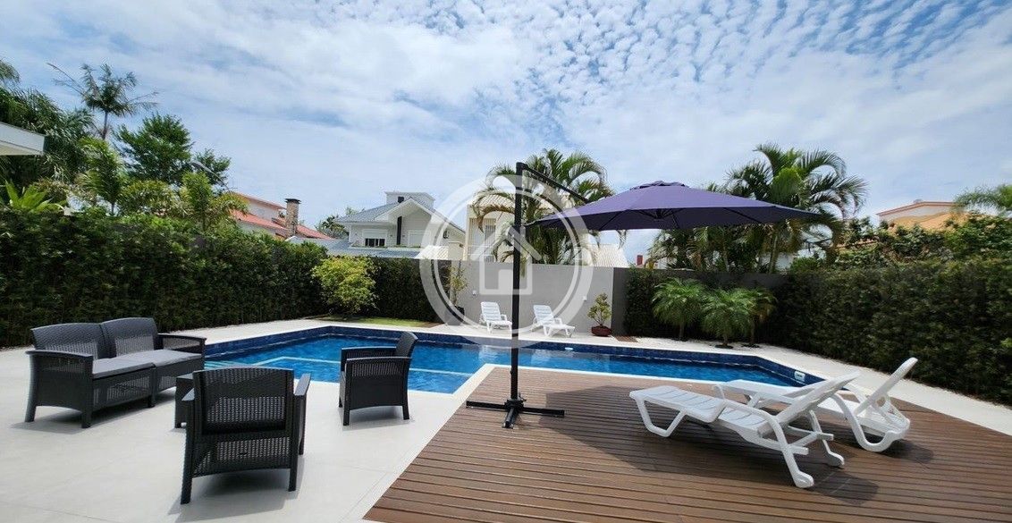 Excelente residência em Jurerê Internacional , totalmente remodelada, contendo 4 dormitórios (uma no terreo e 3 no andar superior), sendo 1 suíte, piscina de concreto 10m X 5m, Ar condicionado em todos os ambientes, churrasqueira interna em vidro, living, sala de estar e jantar totalmente integrados e bem ampla sem degraus ou ressaltos, cozinha gourmet integrada com a area de piscina(tambem sem degraus ou ressaltos), sistema novo de alarme e câmeras externas de vigilancia contratada para sua comodidade e segurança...... Alem de um jardim nos fundos e na entrada. A casa recentemente mobiliada e reformada, esta muito bem localizada em uma rua proxima a principal estando pouco mais de 600mts da praia .
