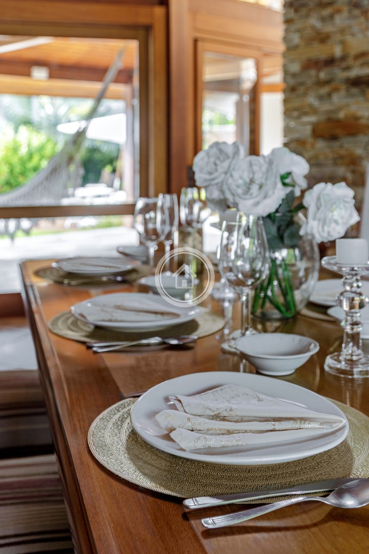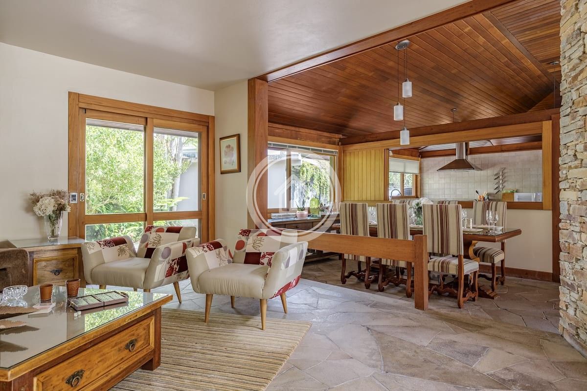 Na área social, os espaços são amplos e integrados: uma sala de estar acolhedora conecta-se à sala de jantar, criando um ambiente perfeito para convivência. A cozinha, se integra à área externa por meio de um generoso balcão de apoio à churrasqueira, promovendo uma experiência leve e descontraída para os hóspedes.