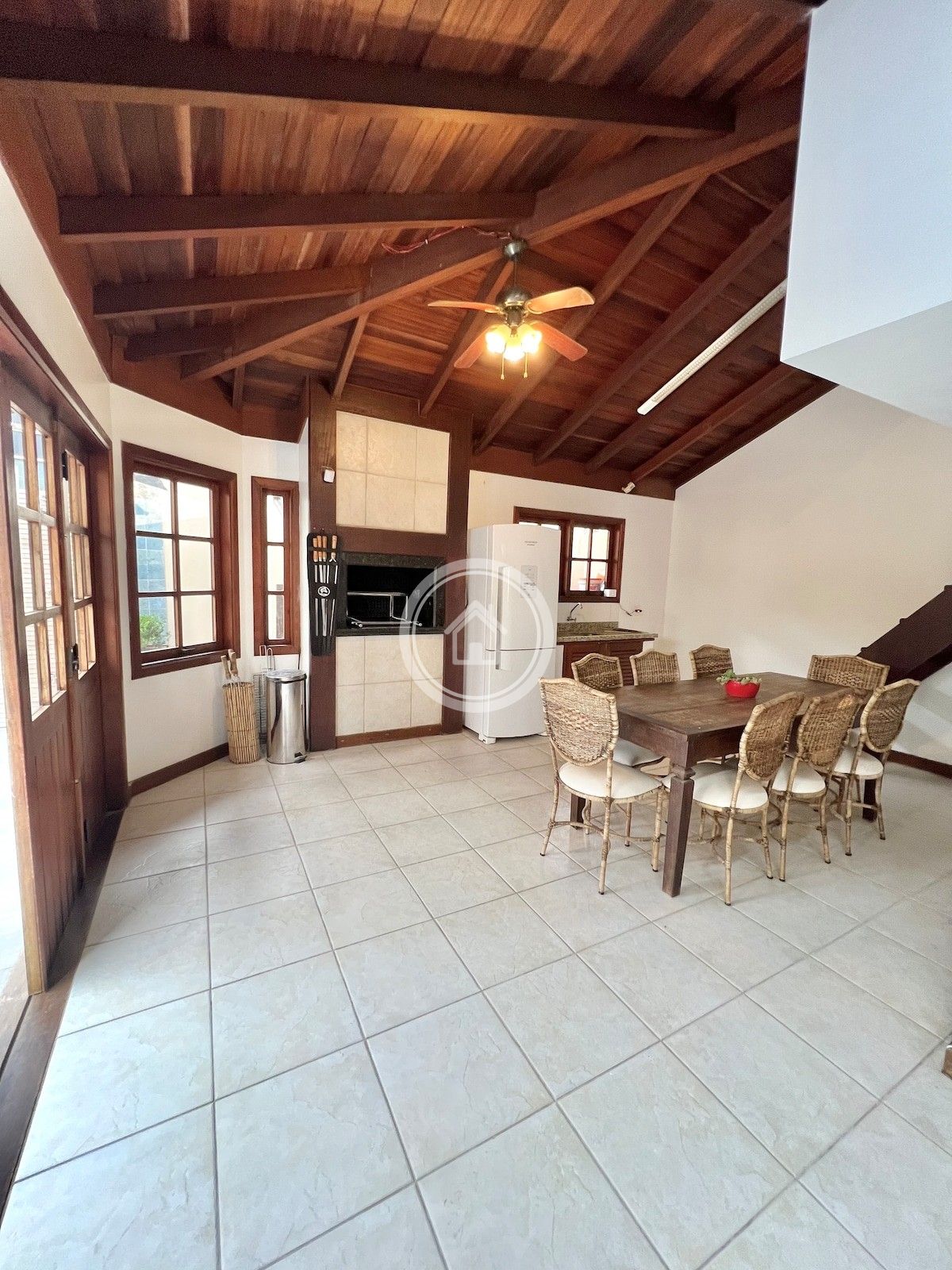 A casa possui detalhes em pedra natural que trazem charme e aconchego para espaço.