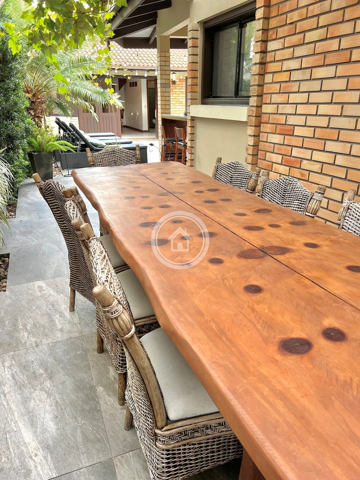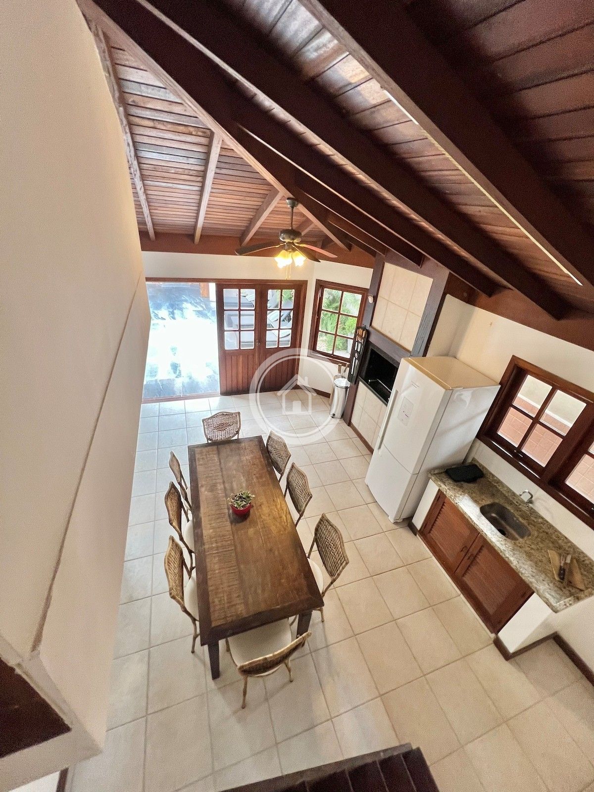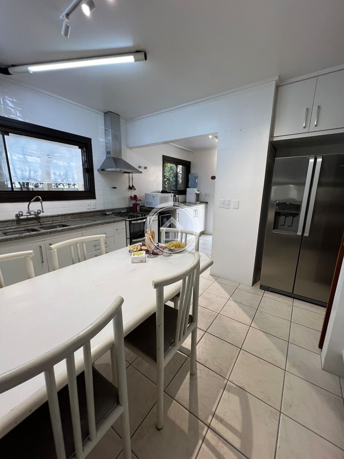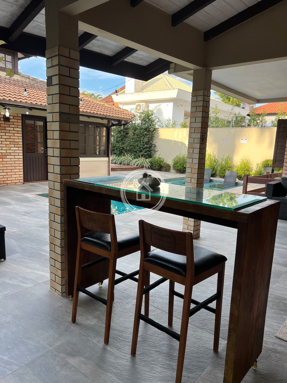 Casa ampla, com sala de estar e jantar integradas, passa-pratos amplo conectando sala de jantar e cozinha, edícula e piscina com hidromassagem.