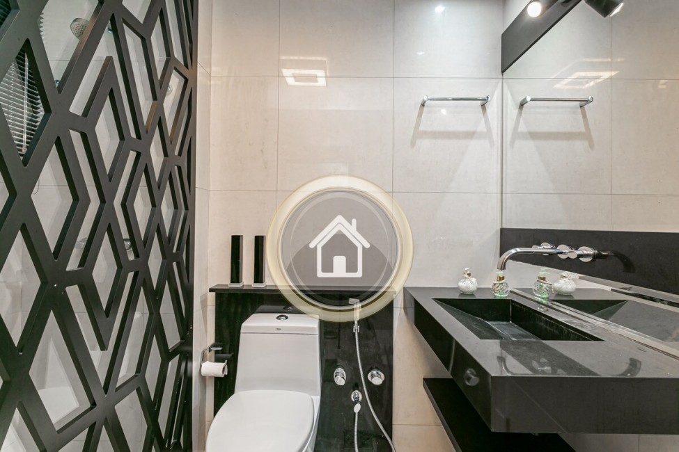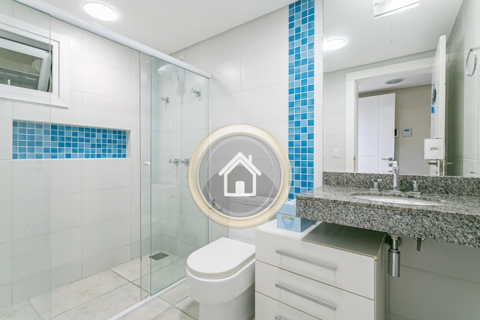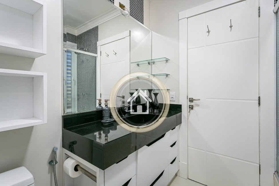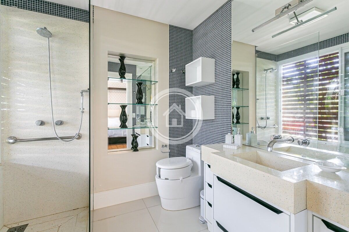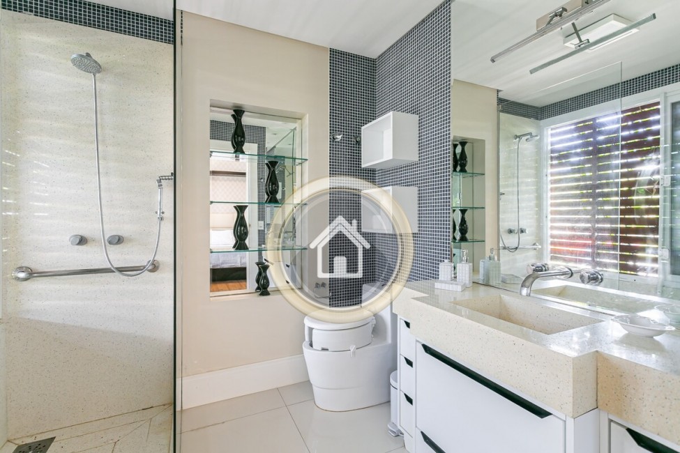 •7 banheiros, um em cada suíte, um para a piscina, o social e outro para a academia