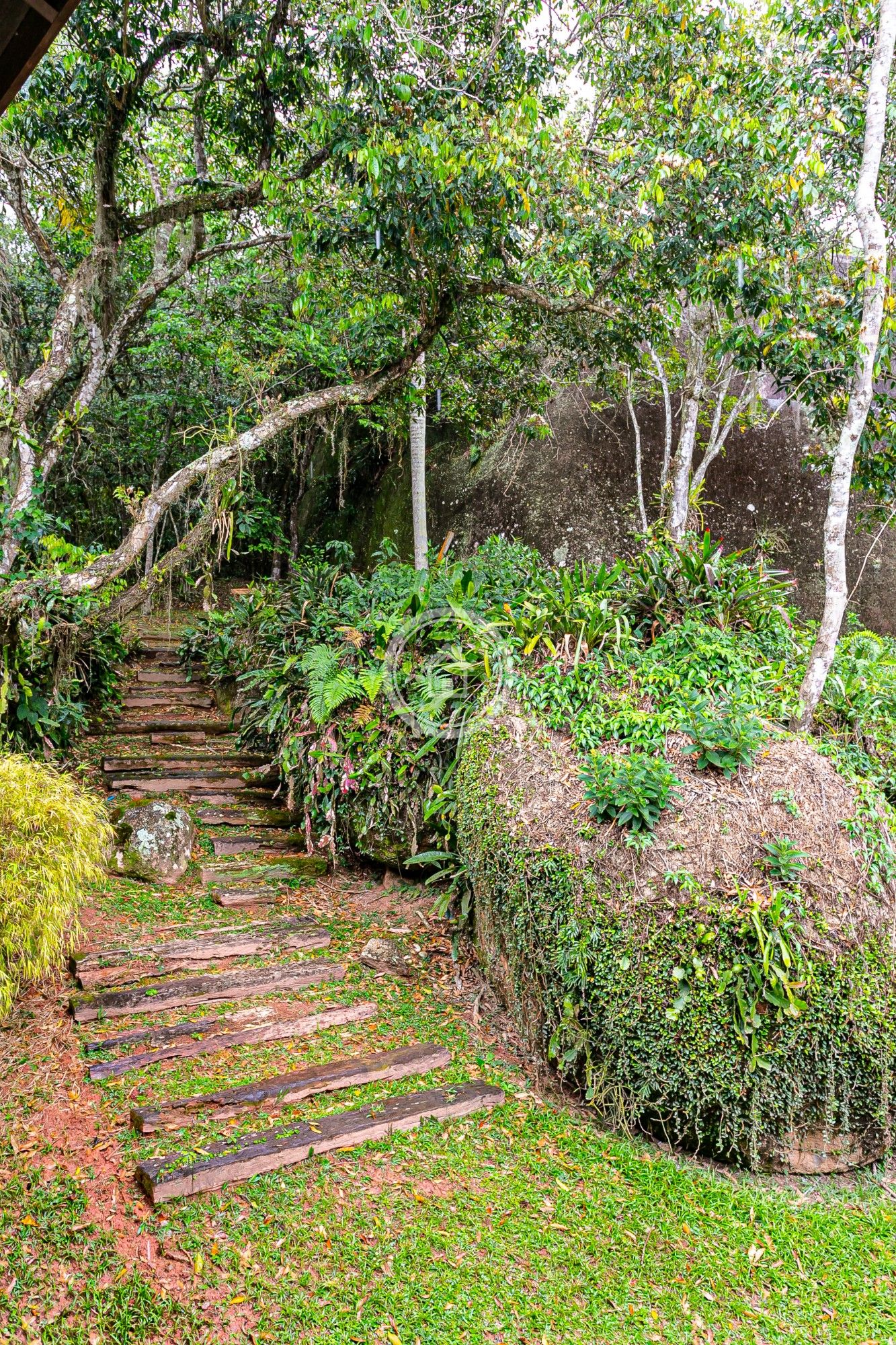 Um vasto gramado, arvores frutíferas, casinha infantil.