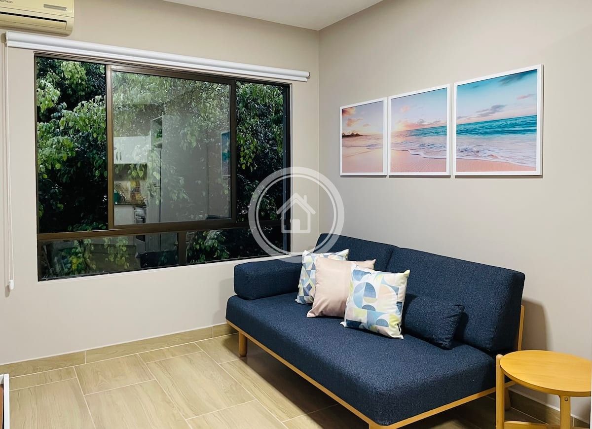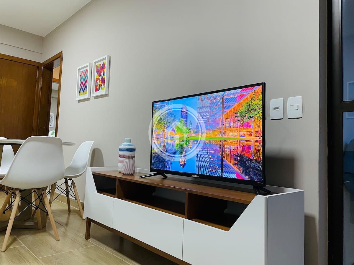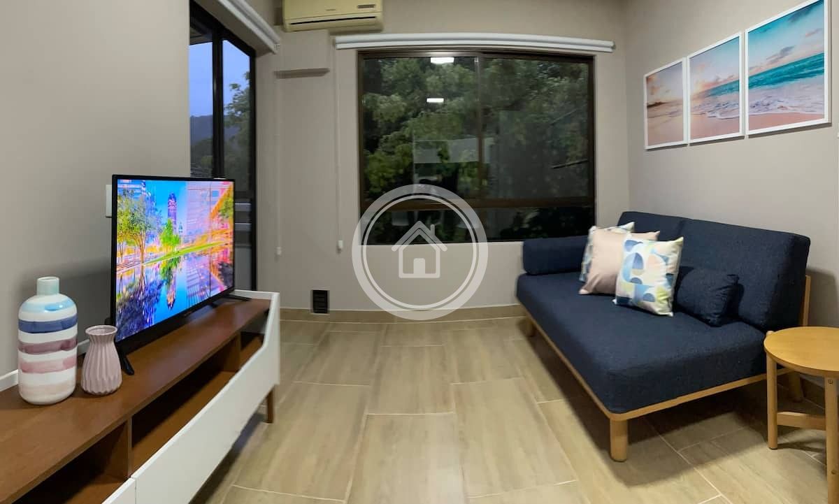 A sala possui uma smart TV de 39" com acesso a Netflix, ar condicionado split, vista para área arborizada, cortinas rolo blackout e um sofa cama de solteiro confortável.