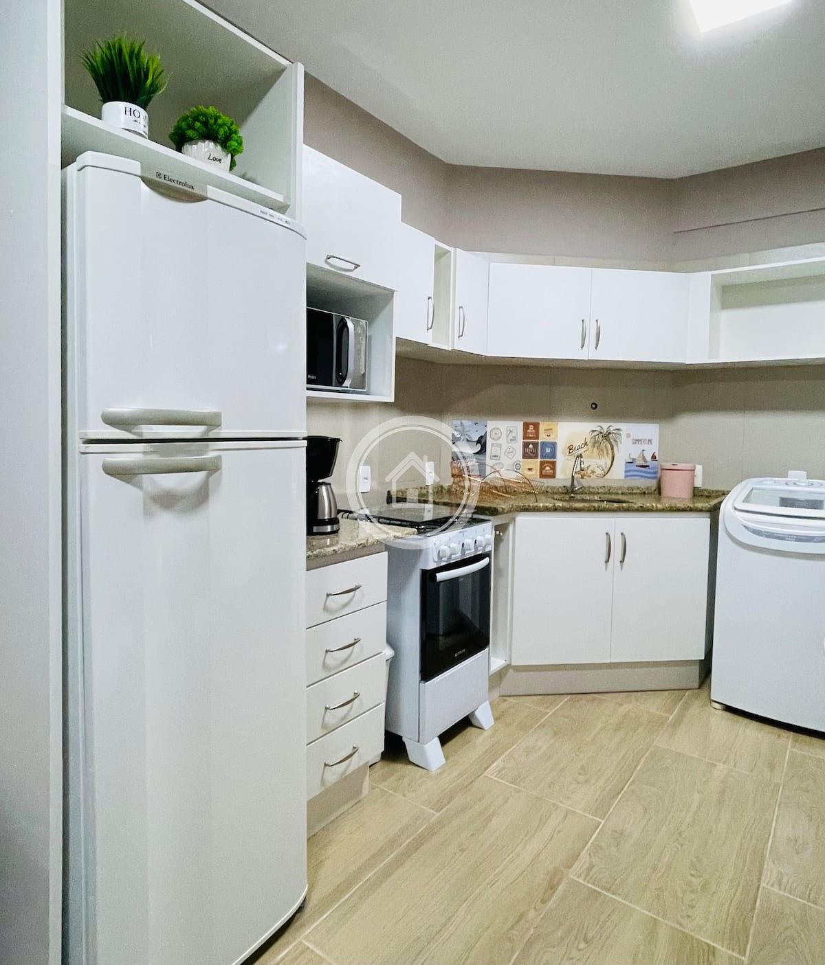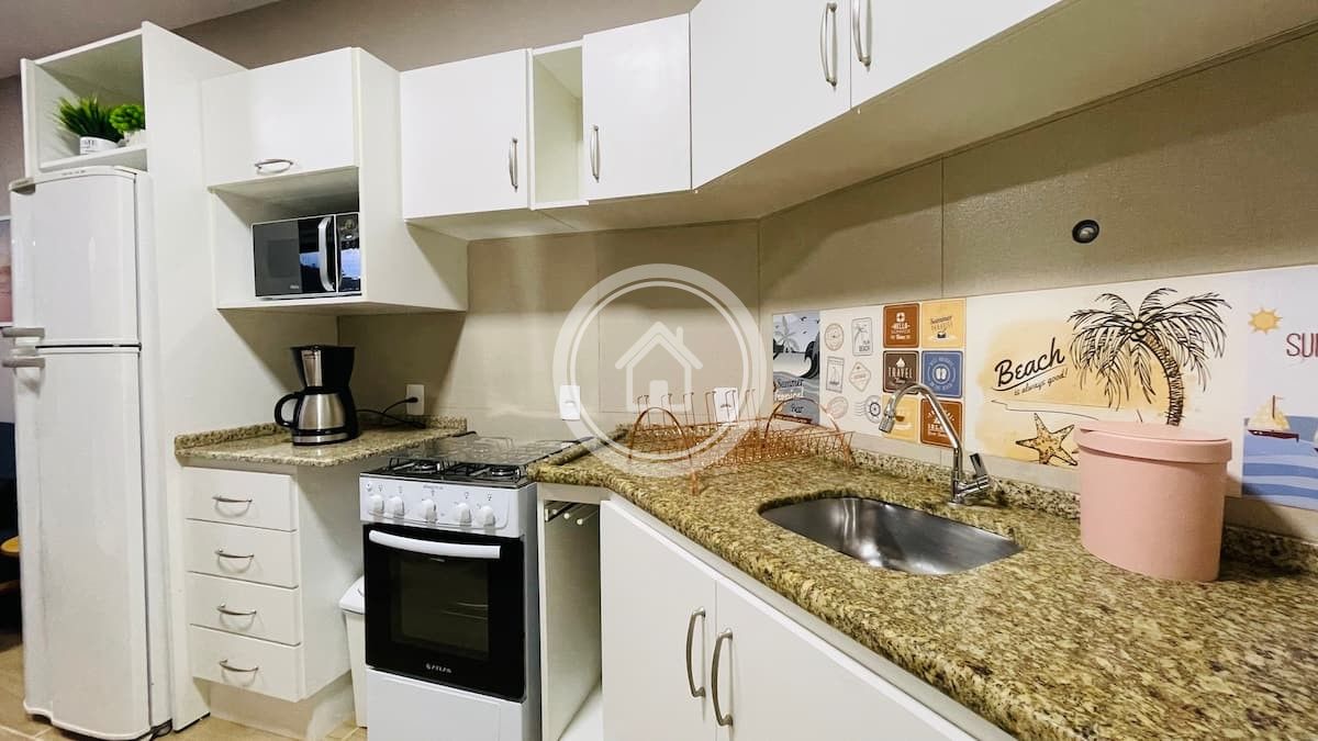 A cozinha é integrada a sala e equipada com Geladeira Dúplex, fogão e forno a gás , microondas, cafeteira e possui uma máquina de lavar roupas.