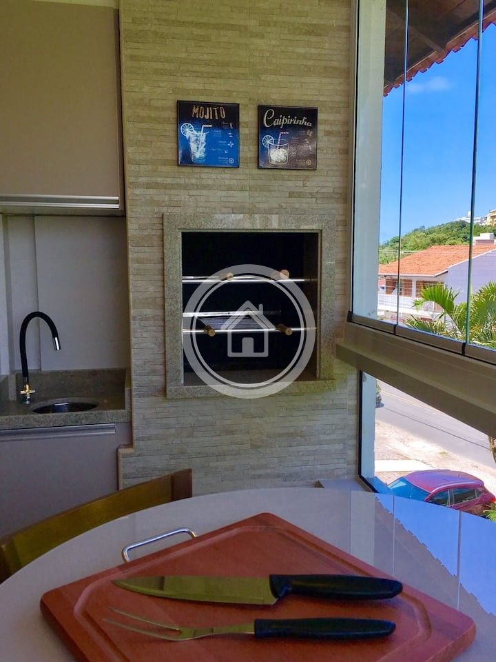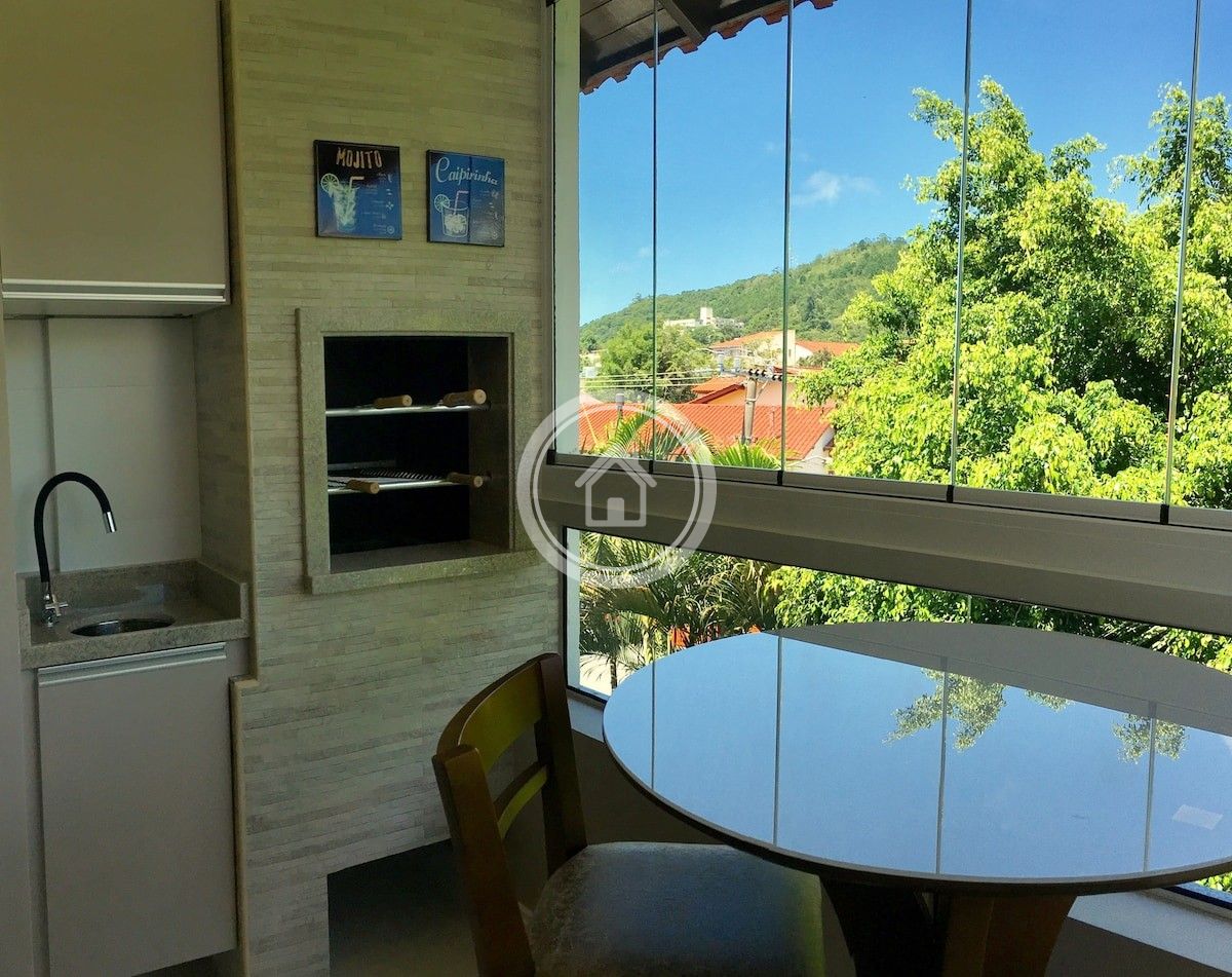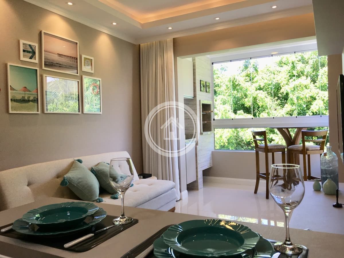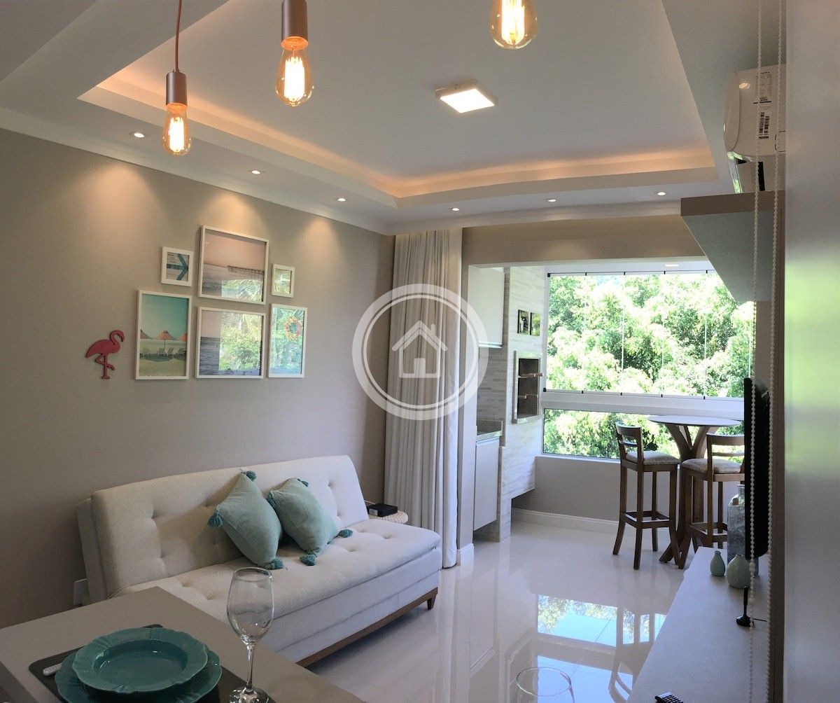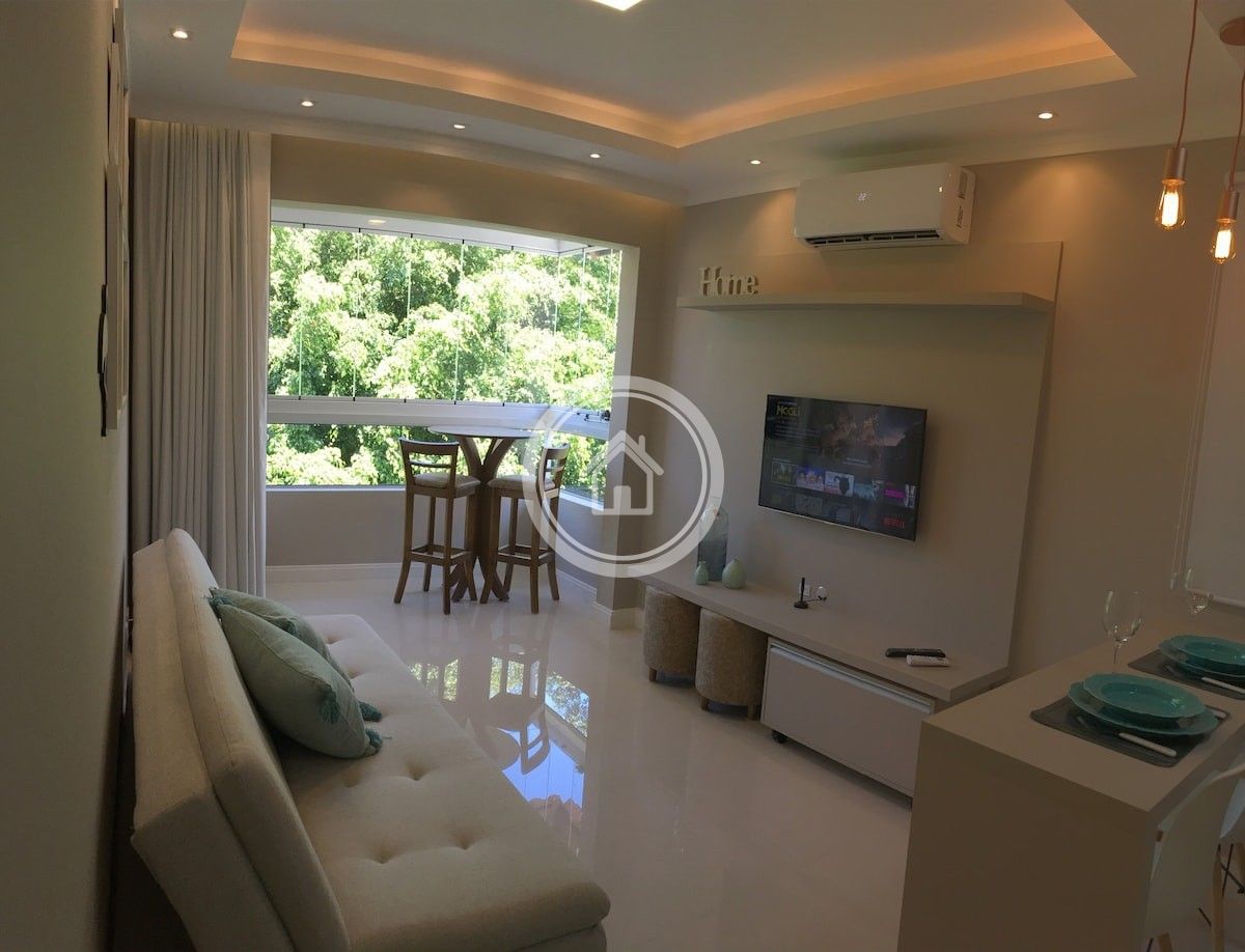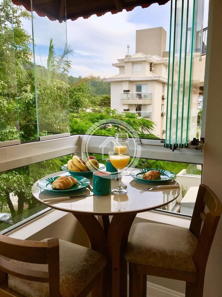 A sala possui uma smart TV de 42" com acesso a Netflix, ar condicionado split e um sofa cama confortável. O ambiente é integrado a sacada que possui vista para área verde e janela com abertura 100%, o que torna o ambiente aconchegante e privativo. A sacada ainda conta com uma churrasqueira toda revestida em pedra de porcelanato que dá um ar sofisticado ao ambiente, uma mesinha bistrô com duas banquetas.