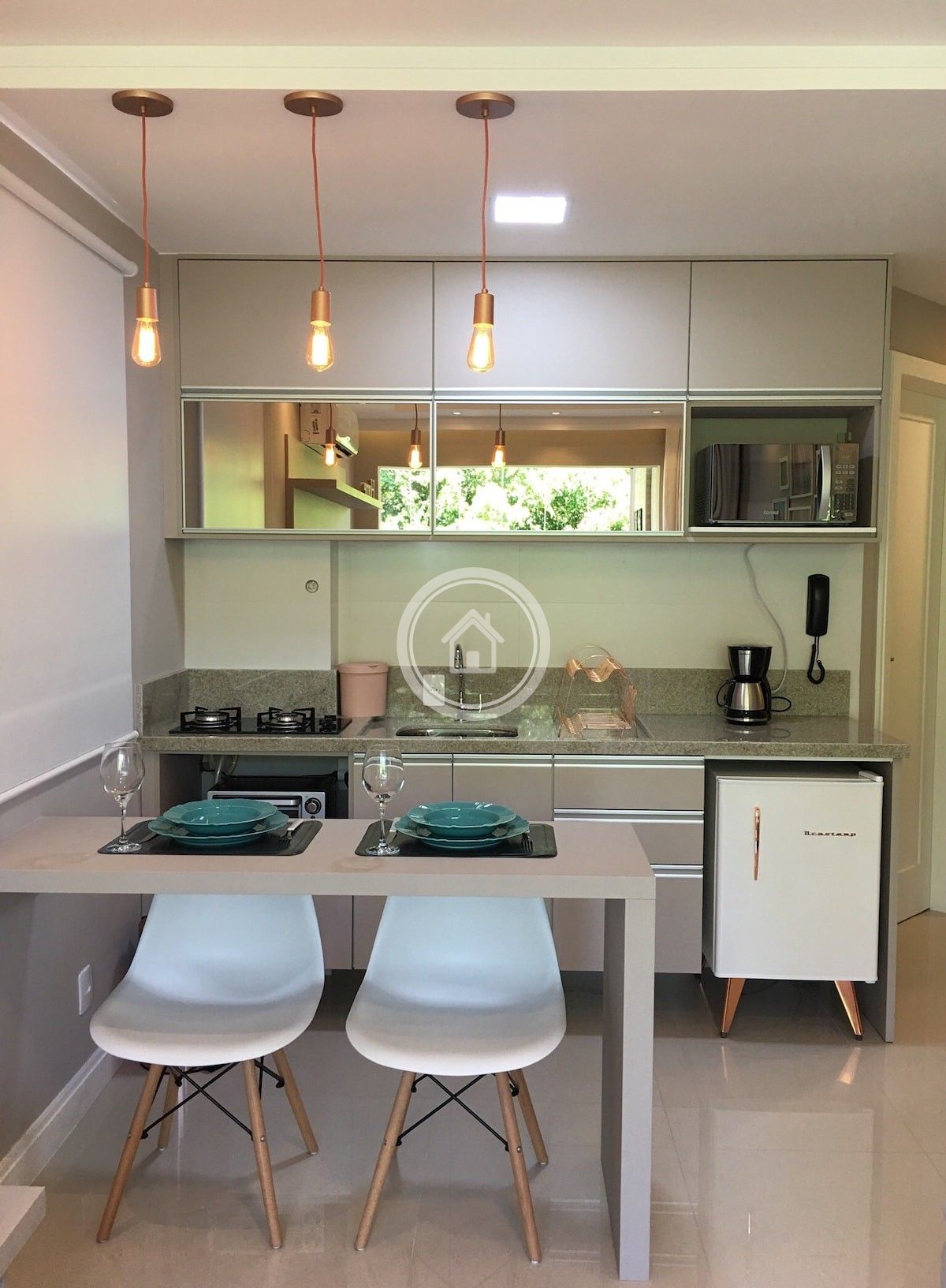 A cozinha é integrada a sala e equipada com frigobar retrô, cooktop, microondas, forninho elétrico e cafeteira.