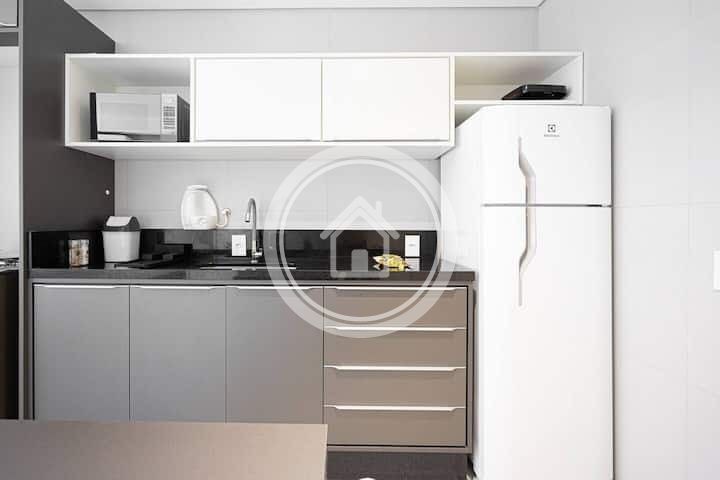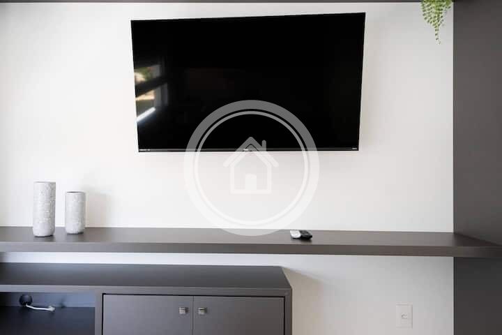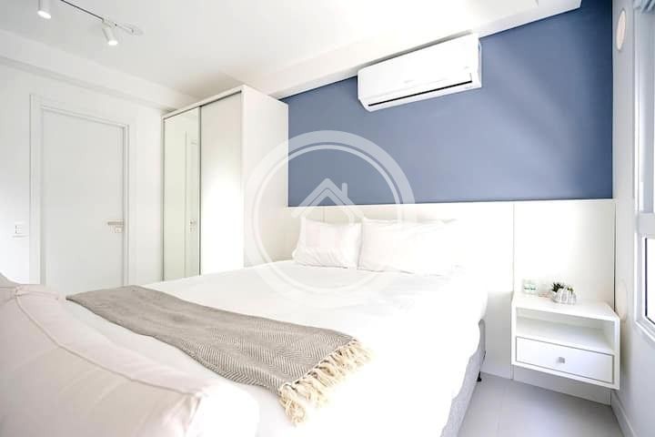 Equipado com ar condicionado, TV smart, Chromecast, Google Nest, Home Theater, itens de cozinha completos, lençóis percal 200 fios e toalhas 100% algodão de fio penteado para seu maior conforto.