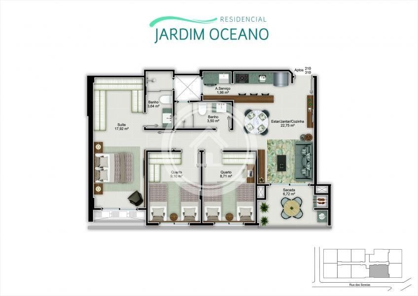 Apartamento 2 sendo 1 suíte, banheiro social, sala de estar e jantar, cozinha, área de serviço e sacada com churrasqueira a carvão e 1 vaga de garagem. As unidades contam com aquecimento de água a gás, piso porcelanato, esquadrias com persianas automatizadas nos dormitórios e espera para ar condicionado split. O empreendimento conta com espaço gourmet, piscina e elevador e está localizado à 300 metros da Praia e próximo a agência dos bancos, escolas, mercados, farmácia e comercial em geral.