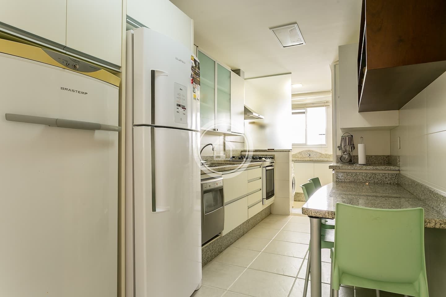 Possui sala de estar, sala de jantar, sacada com churrasqueira, lavabo, área de serviço com máquina de lavar e secar roupa e ferro de passar roupa, cozinha com geladeira. Possui Internet WiFi, Tv por assinatura e 2 garagens.
