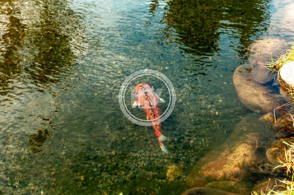 Área verde com lago e fonte, carpas e pista para caminhada.