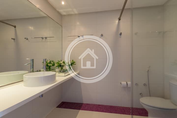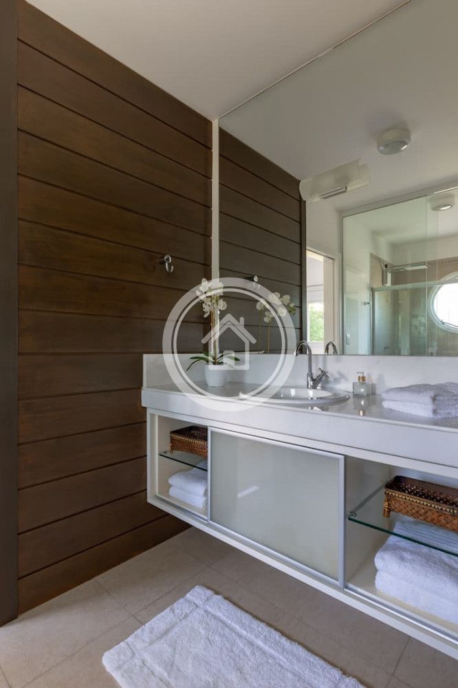- 01 Suite Master na casa principal, com banheira e ducha dupla, cama king sob medida (2,00m x 2,30m), closet, varanda com vista para o mar, chaise, lareira, spa e ampla bancada com duas pias