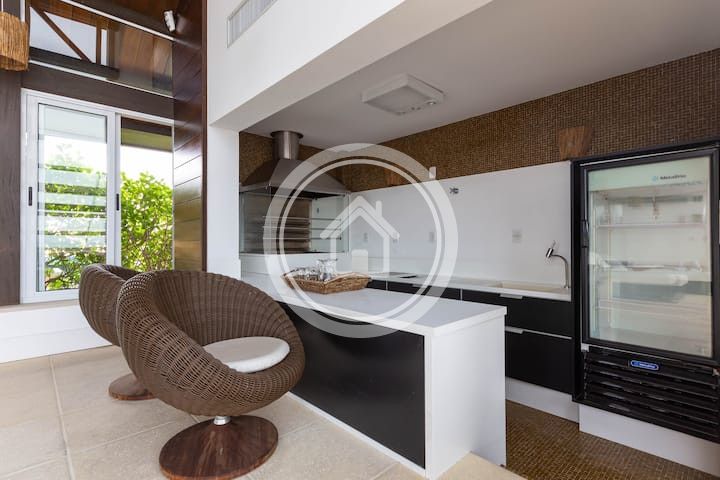 Esta maravilhosa residência com saída exclusiva para a praia, duas piscinas com aquecimento ,uma externa e outra interna, atende confortavelmente 14 pessoas, com todos ambientes climatizados.