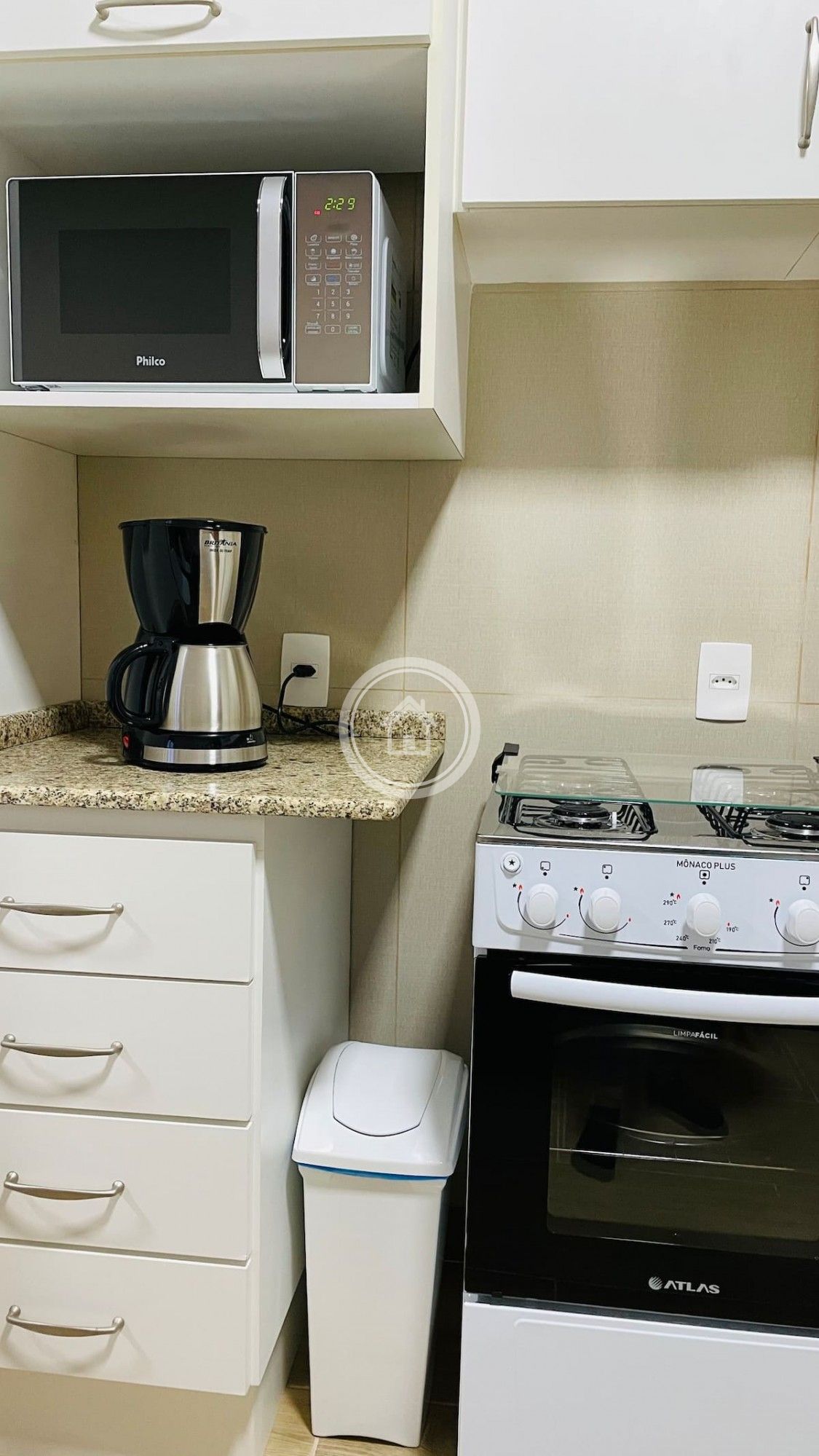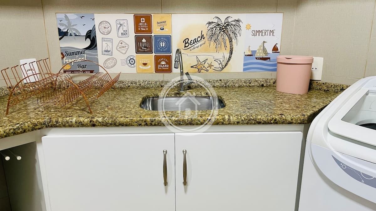 A cozinha é integrada a sala e equipada com Geladeira Dúplex, fogão e forno a gás , microondas, cafeteira e possui uma máquina de lavar roupas.