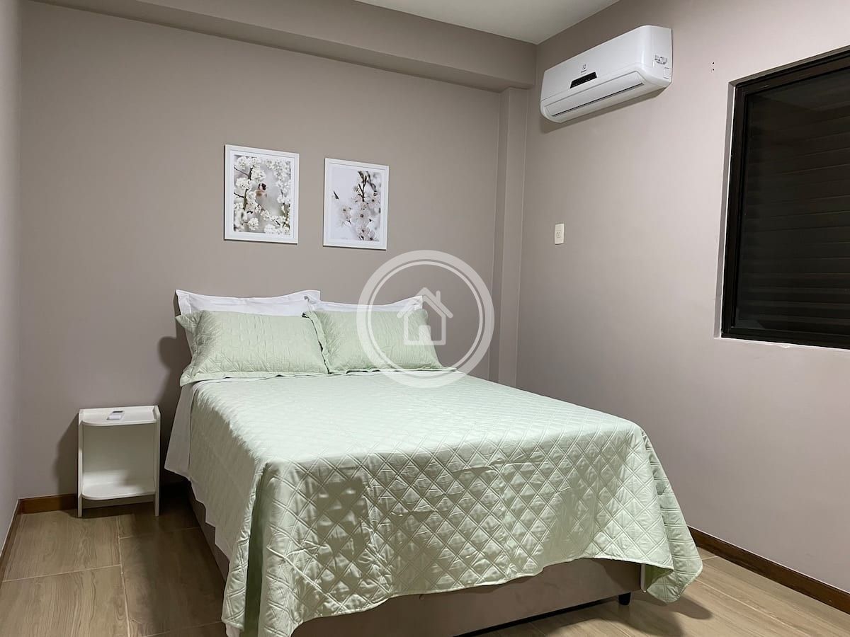 O quarto principal possui uma cama de casal com colchão ortobom D33, travesseiros macios, ar condicionado split, roupeiro duas portas com espelho.