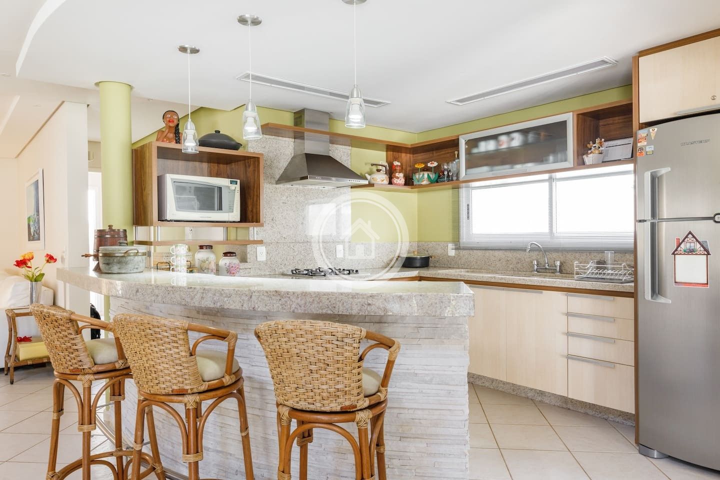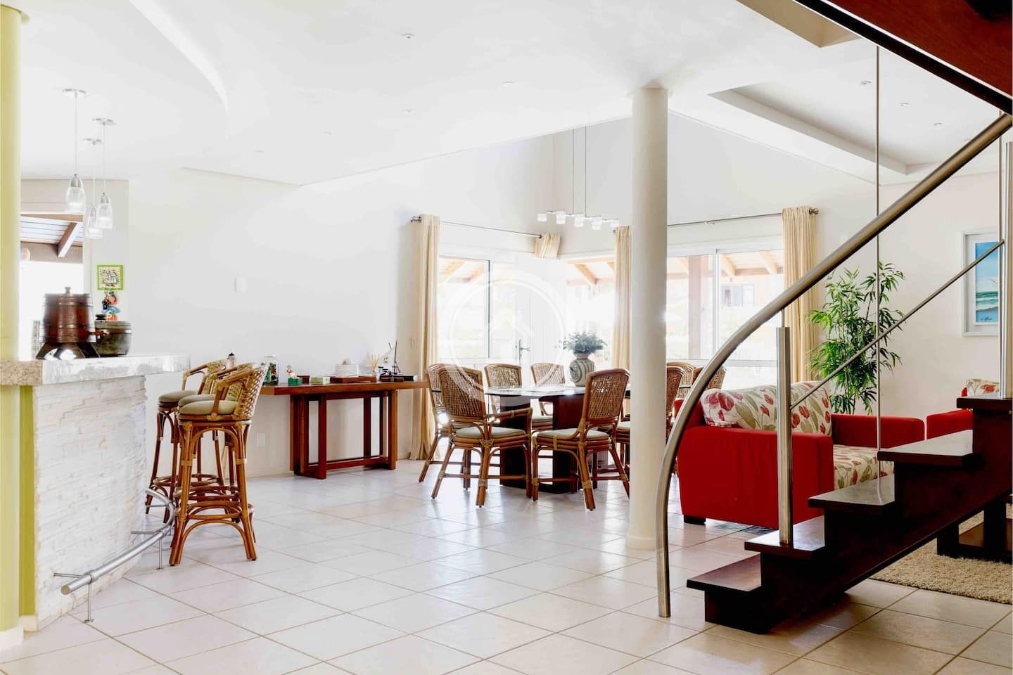 A churrasqueira fica em uma varanda, entre a cozinha e a piscina, ambiente integrados, assim como as duas salas de star e sala de jantar.