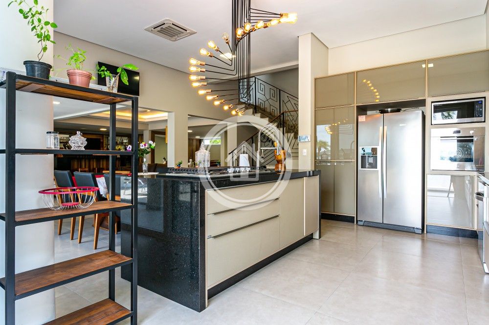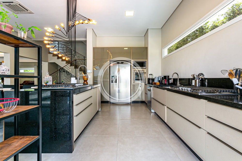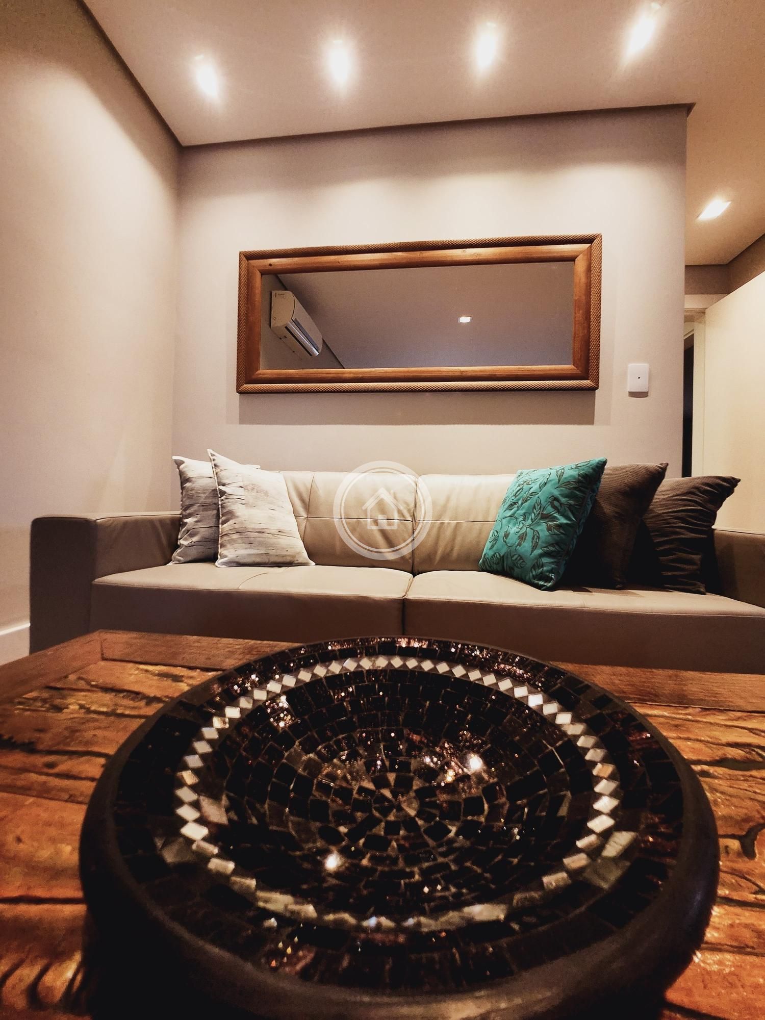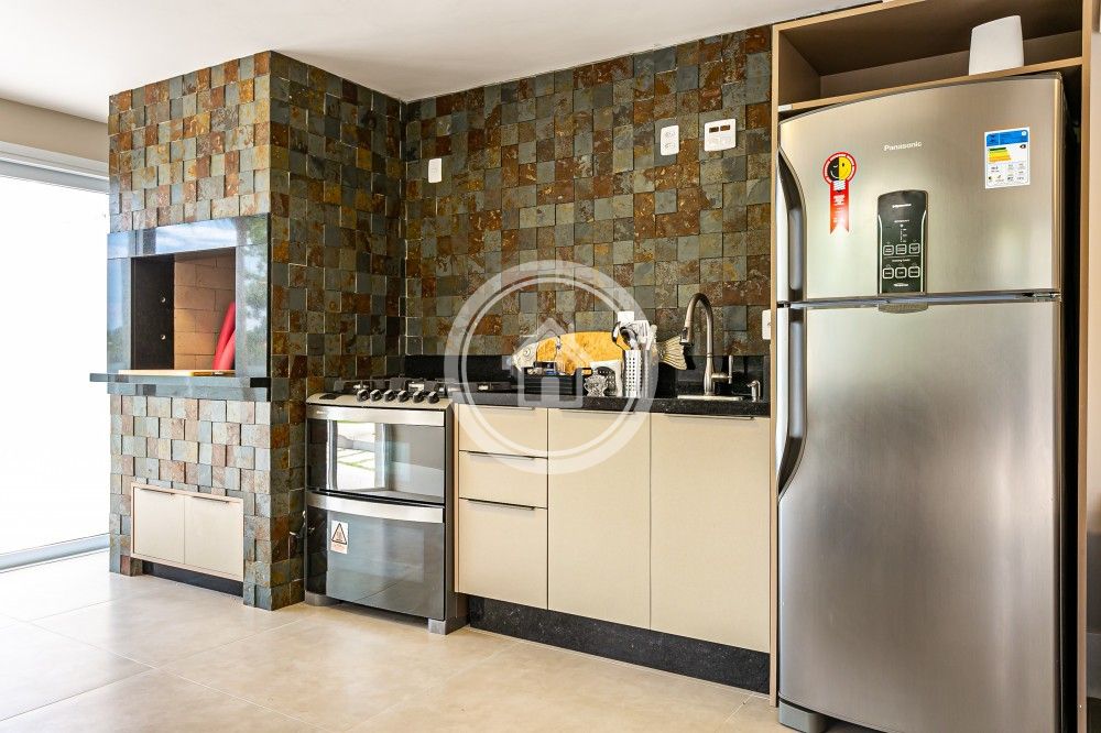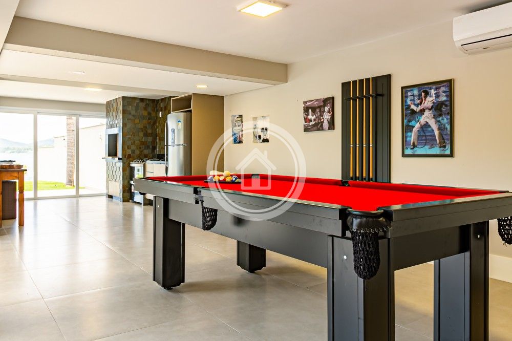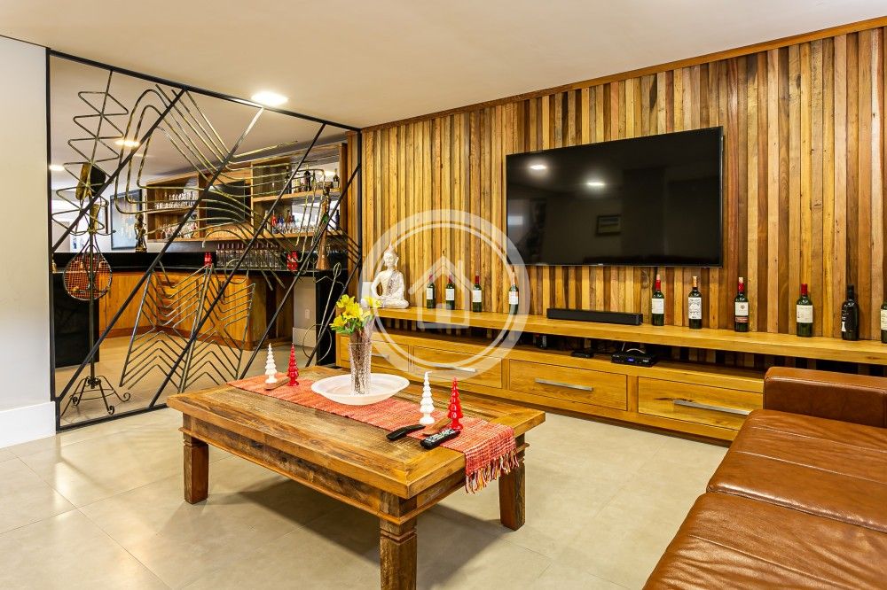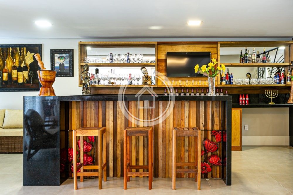 Conta com área gourmet integrada a um espaço de jogos e ainda um barzinho próximo a área de living da sala.
