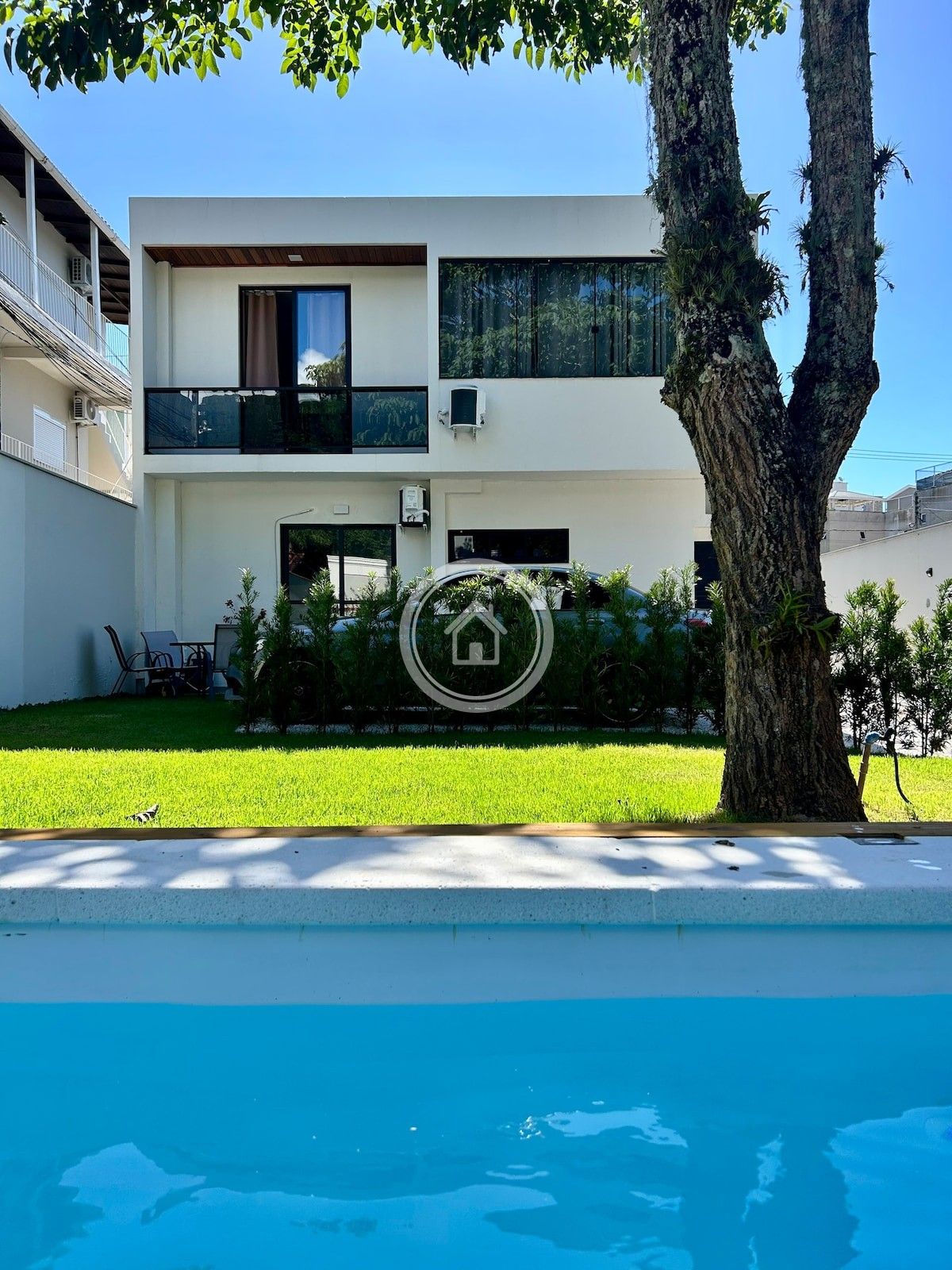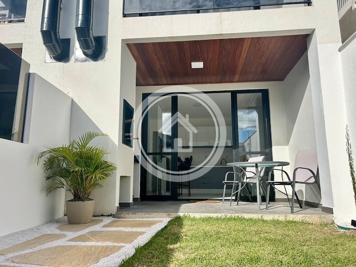 Duas casas juntas com jardim e piscina privativos! Perfeitas para grupos grandes ou várias famílias. Localização central em Jurerê, a 400 m da praia (sem morros) e perto de bares, restaurantes, salões e academias. Cada casa tem jardim na frente, cozinha completa e área com churrasqueira. Estacionamento para 2 carros no local. Todas as comodidades. Veja meu perfil para as casas separadas. São 2 camas queen, 6 de solteiro (ou unidas) e 1 sofá-cama de casal. Até 12 pessoas!
