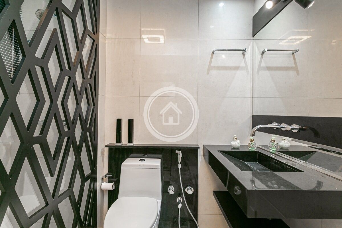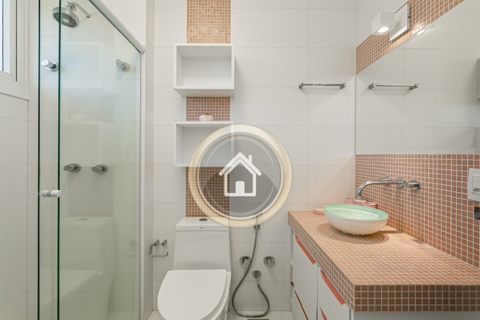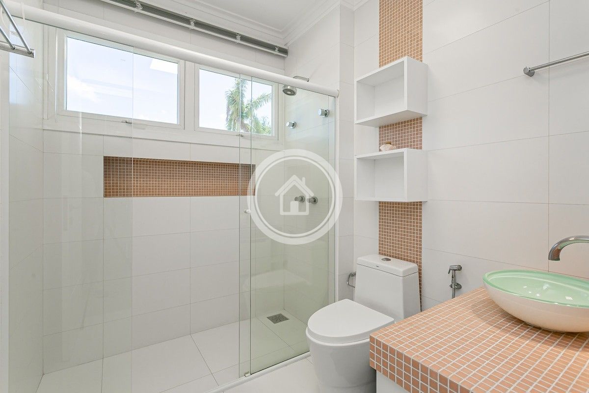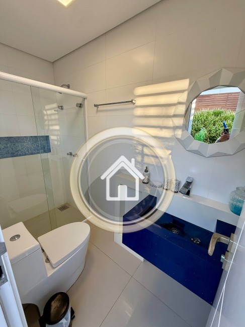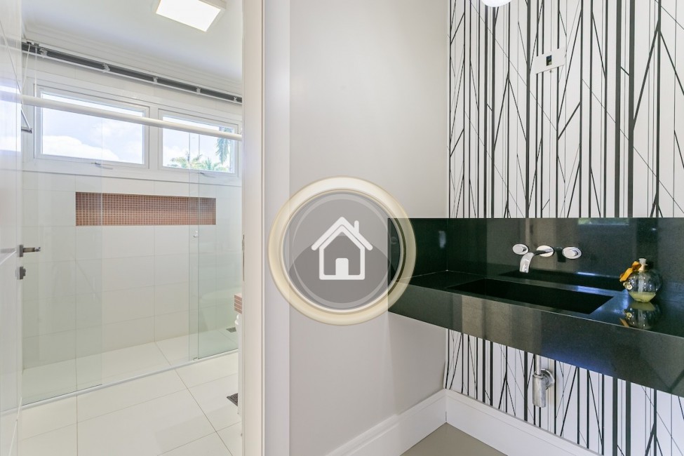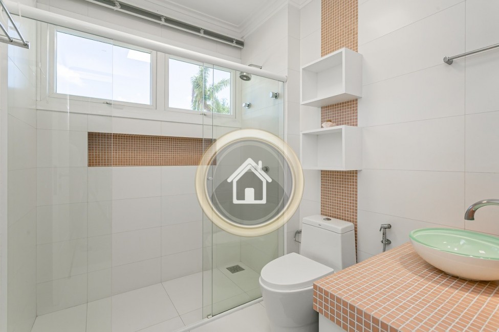 •7 banheiros, um em cada suíte, um para a piscina, o social e outro para a academia