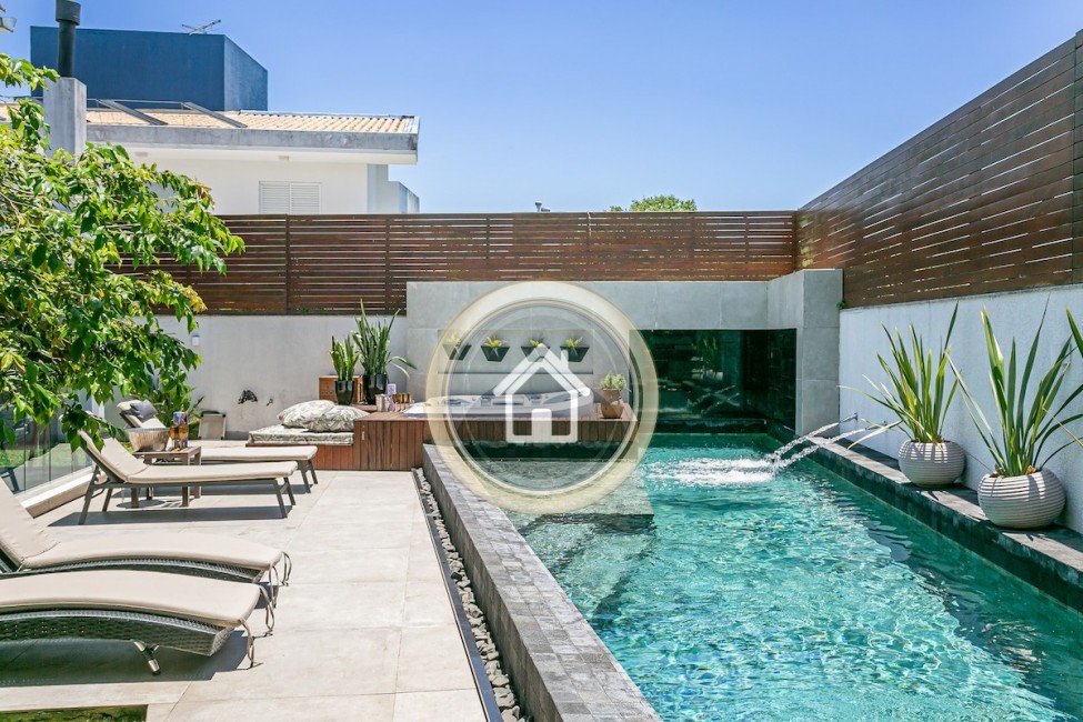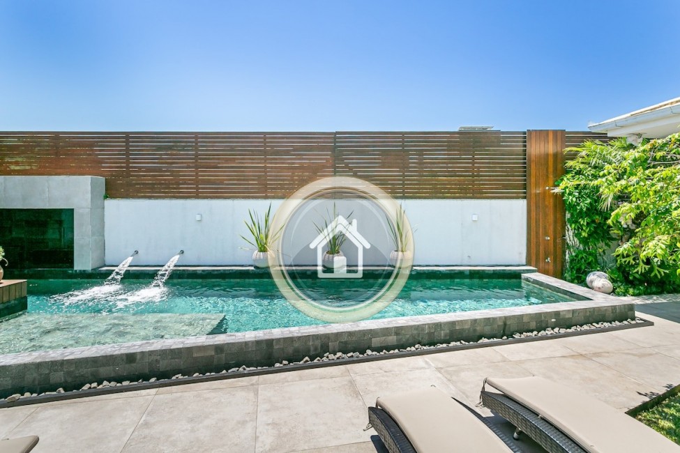•Piscina Aquecida com cascata e jatos de masagem, água aquecida e revestida com pedra Hijau, cascata e jatos de massagem