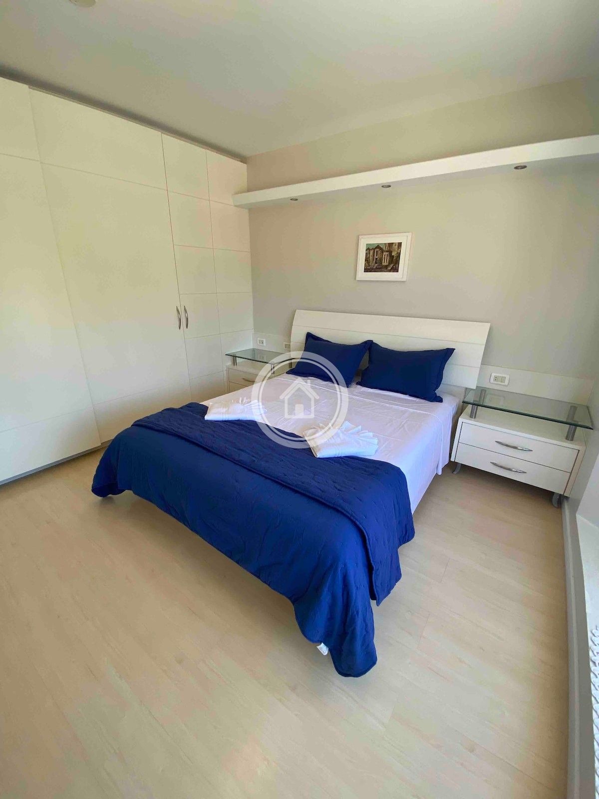 A casa possui 3 suítes e 2 demi-suítes (uma com uma cama de casal e a outra com duas camas de solteiro e uma bicama), todas com ar condicionado e armários.