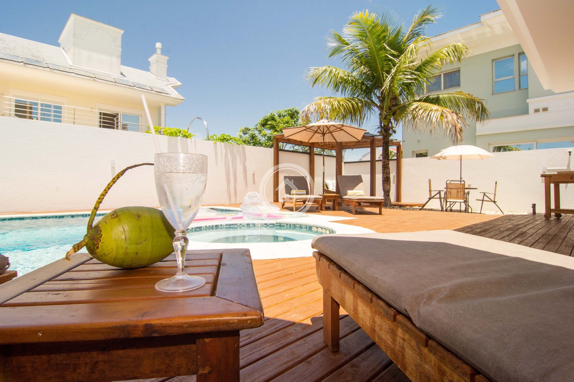 A área externa conta com jardim e uma deliciosa piscina que integra a área gourmet a uma convidativa churrasqueira, além de bangalôs e espreguiçadeiras para curtir um belo dia de sol, tudo isso com muito requinte e sossego.