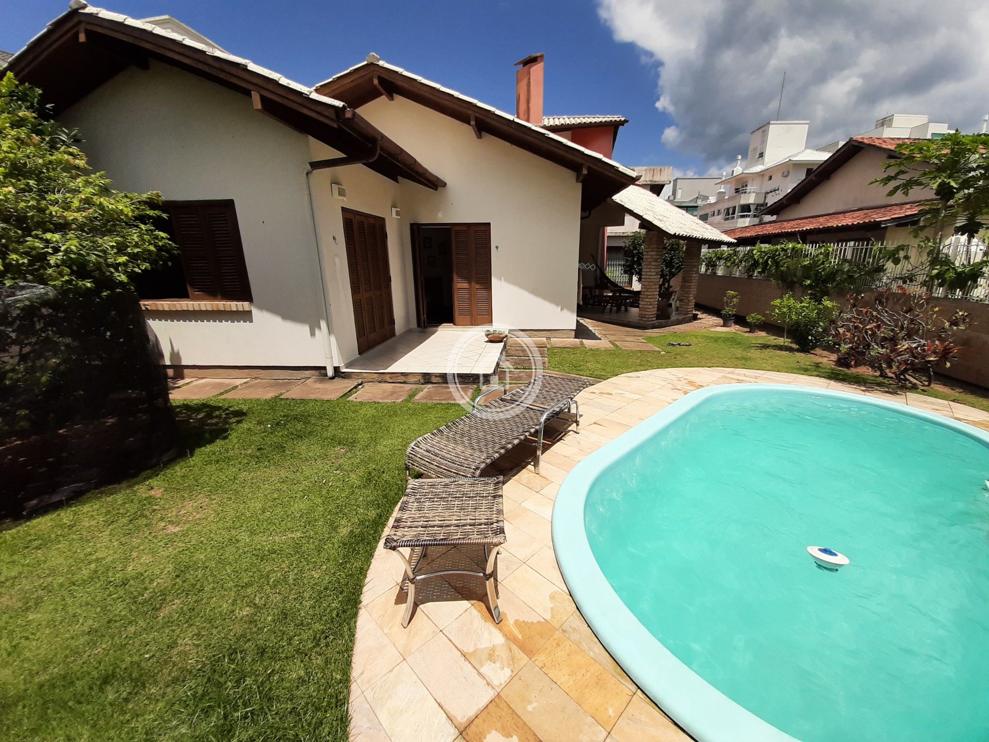 Casa com excelente localização, próximo a praia de Jurere e a bares, restaurantes, mercados. Possui 2 dormitórios, sendo 1 suite, possibilidade de por 2 colchões, 1 casal e 1 solteiro, totalizando a capacidade 6 pessoas no imóvel. Possui área de churrasqueira com piscina.